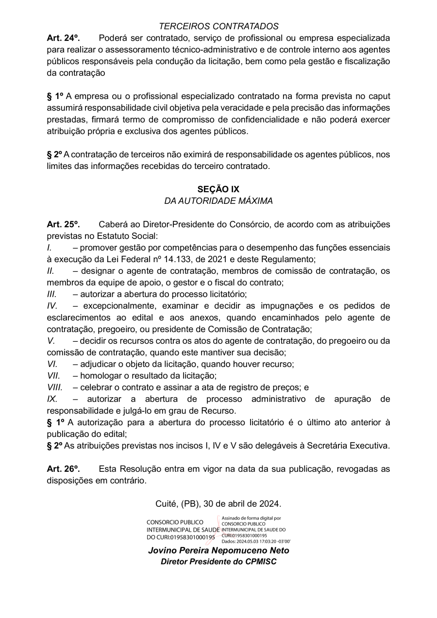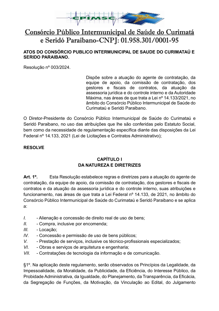 RESOLUÇÃO N° 0003/2024 - DISPÕE SOBRE A ATUAÇÃO DO AGENTE DE CONTRATAÇÃO, DA EQUIPE DE APOIO, DA COMISSÃO DE CONTRATAÇÃO, DOS GESTORES E FISCAIS DE CONTRATOS, DA ATUAÇÃO DA ASSESSORIA JURÍDICA E DO CONTROLE INTERNO E DA AUTORIDADE MÁXIMA, NAS ÁREAS DE QUE TRATA A LEI Nº 14.133/2021, NO ÂMBITO DO CONSÓRCIO PÚBLICO INTERMUNICIPAL DE SAÚDE DO CURIMATAÚ E SERIDÓ PARAIBANO