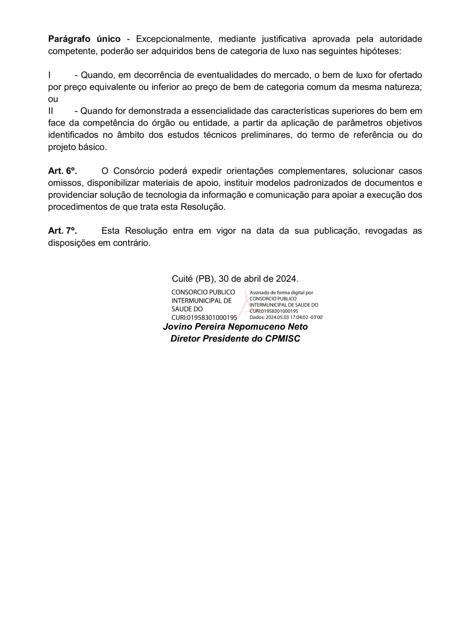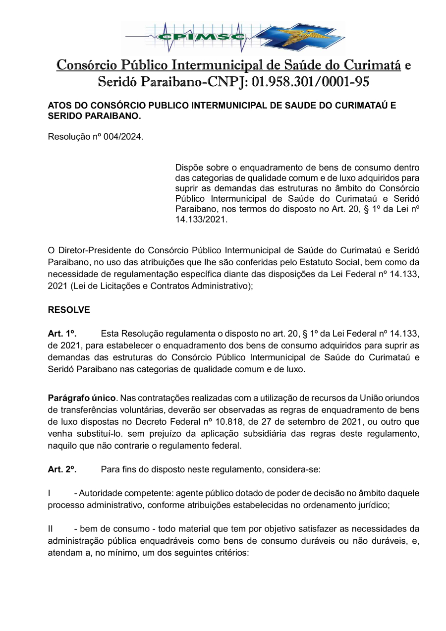 RESOLUÇÃO N° 0004/2024 - DISPÕE SOBRE O ENQUADRAMENTO DE BENS DE CONSUMO DENTRO DAS CATEGORIAS DE QUALIDADE COMUM E DE LUXO ADQUIRIDOS PARA SUPRIR AS DEMANDAS DAS ESTRUTURAS NO ÂMBITO DO CONSÓRCIO PÚBLICO INTERMUNICIPAL DE SAÚDE DO CURIMATAÚ E SERIDÓ PARAIBANO, NOS TERMOS DO DISPOSTO NO ART. 20, § 1º DA LEI Nº 14.133/2021