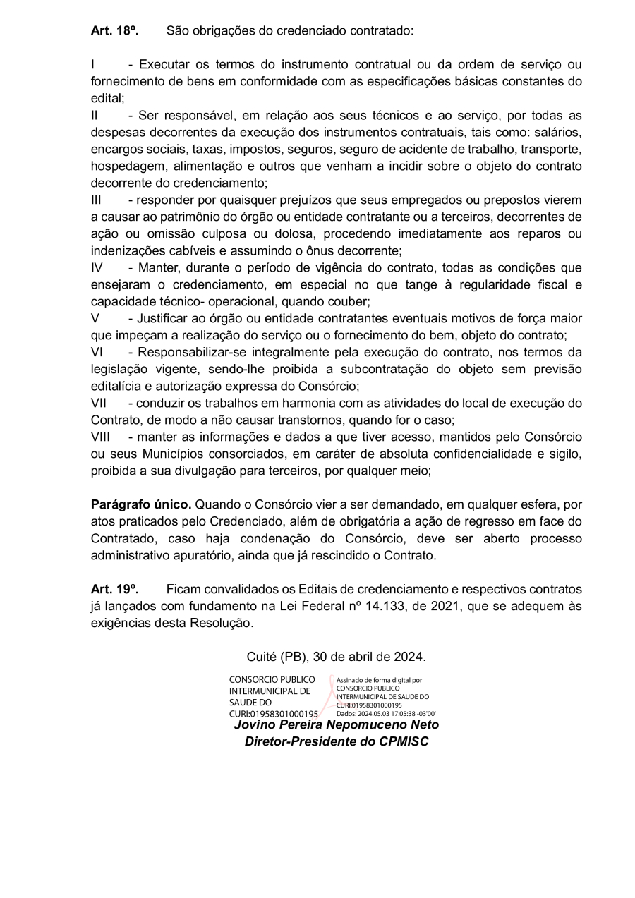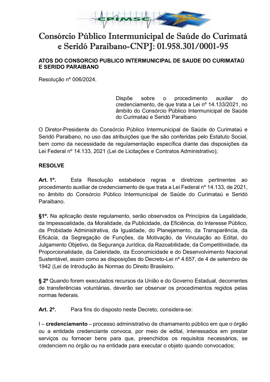 RESOLUÇÃO N° 0006/2024 - DISPÕE SOBRE O PROCEDIMENTO AUXILIAR DO CREDENCIAMENTO, DE QUE TRATA A LEI Nº 14.133/2021, NO ÂMBITO DO CONSÓRCIO PÚBLICO INTERMUNICIPAL DE SAÚDE DO CURIMATAÚ E SERIDÓ PARAIBANO