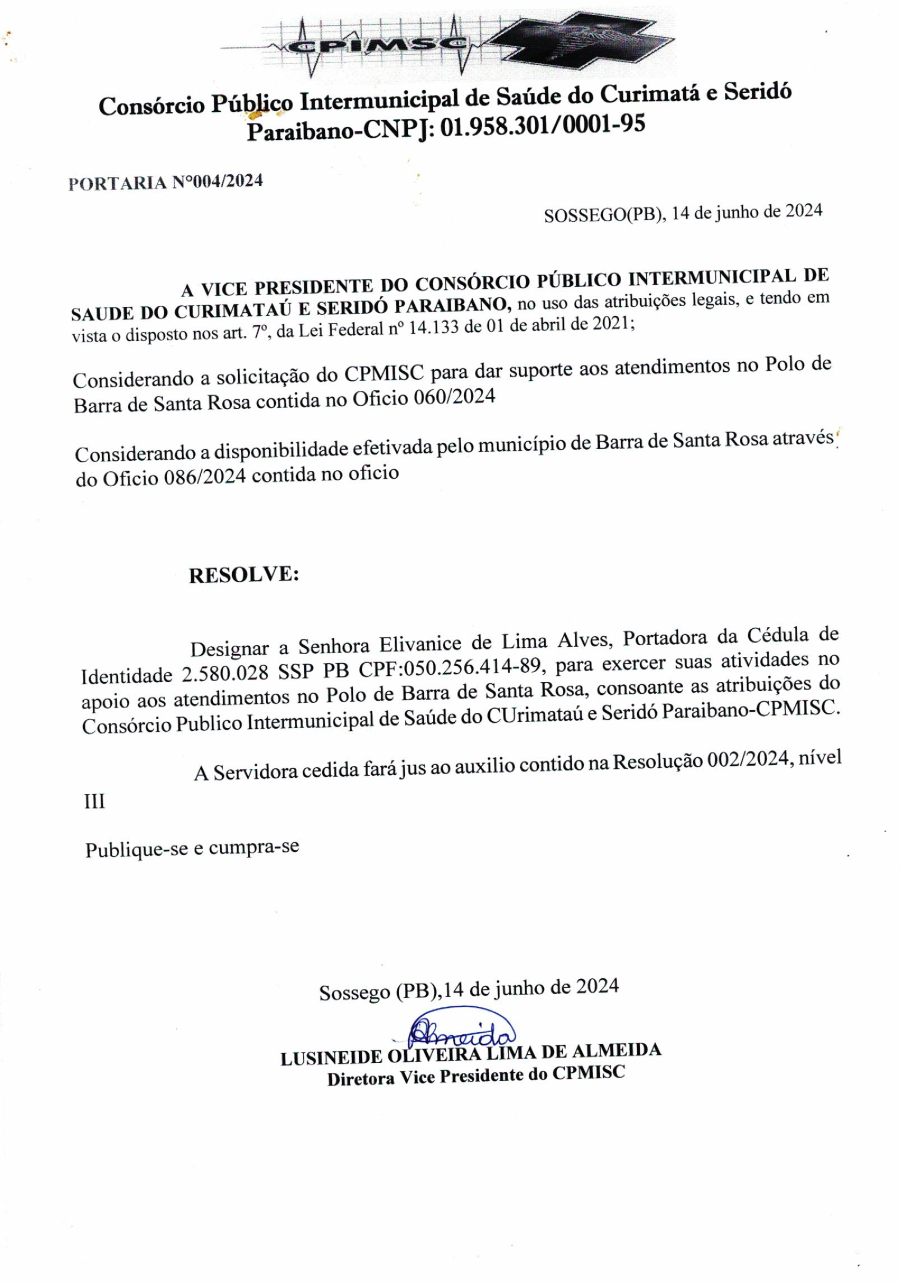 PORTARIA N° 0004/2024 - DESIGNA A SENHORA ELIVANICE DE LIMA ALVES PARA EXECER SUAS ATIVIDADES NO APOIO AO ATENDIMENTOS NO POLO DE BARRA DE SANTA ROSA
