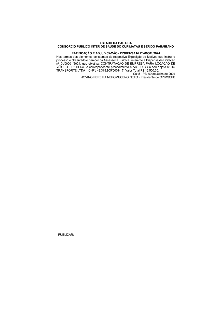 RATIFICAÇÃO E ADJUDICAÇÃO - DISPENSA N° DV 0001/2024
