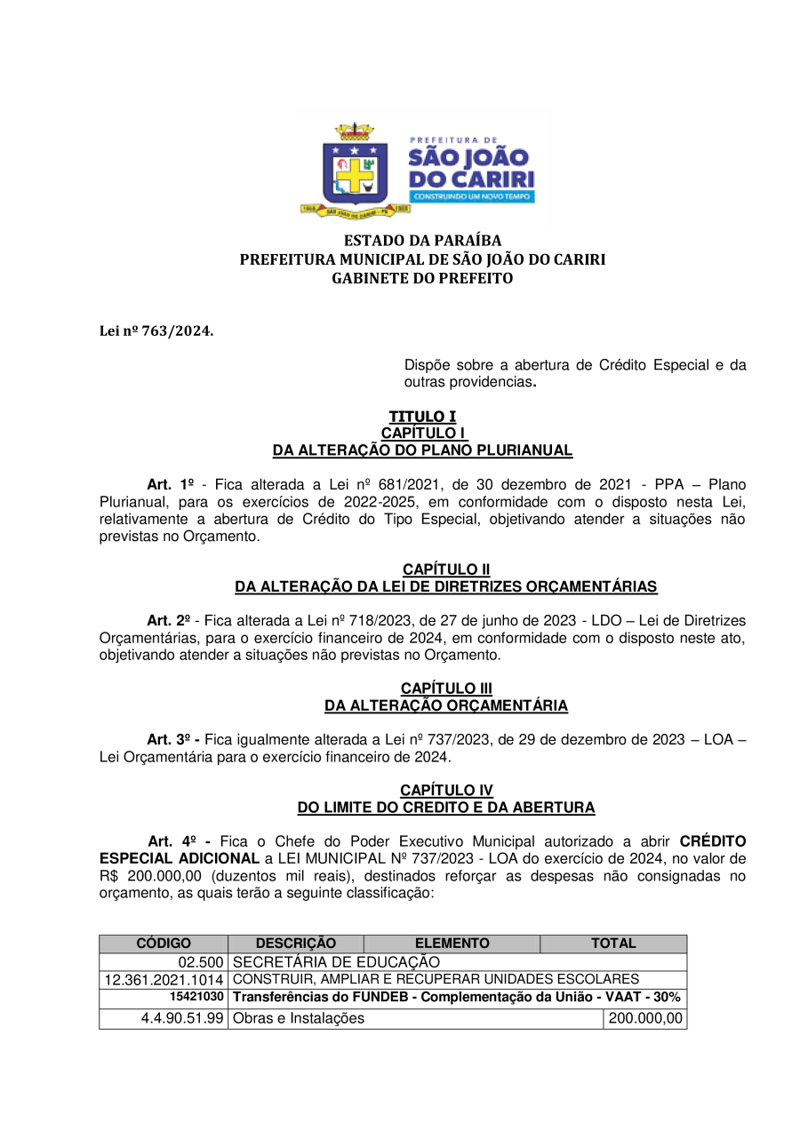 LEI 763/2024- ABERTURA DE CRÉDITO ESPECIAL