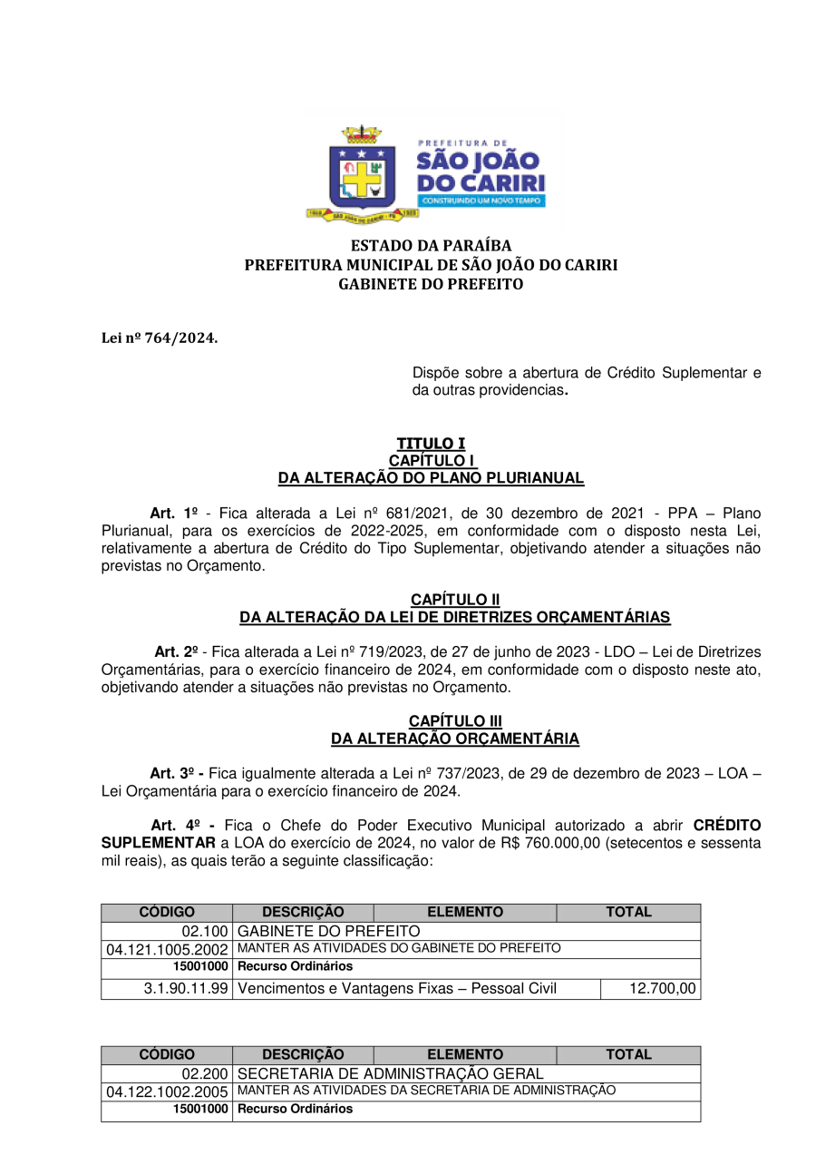 LEI 764/2024 - ABERTURA DE CRÉDITO SUPLEMENTAR