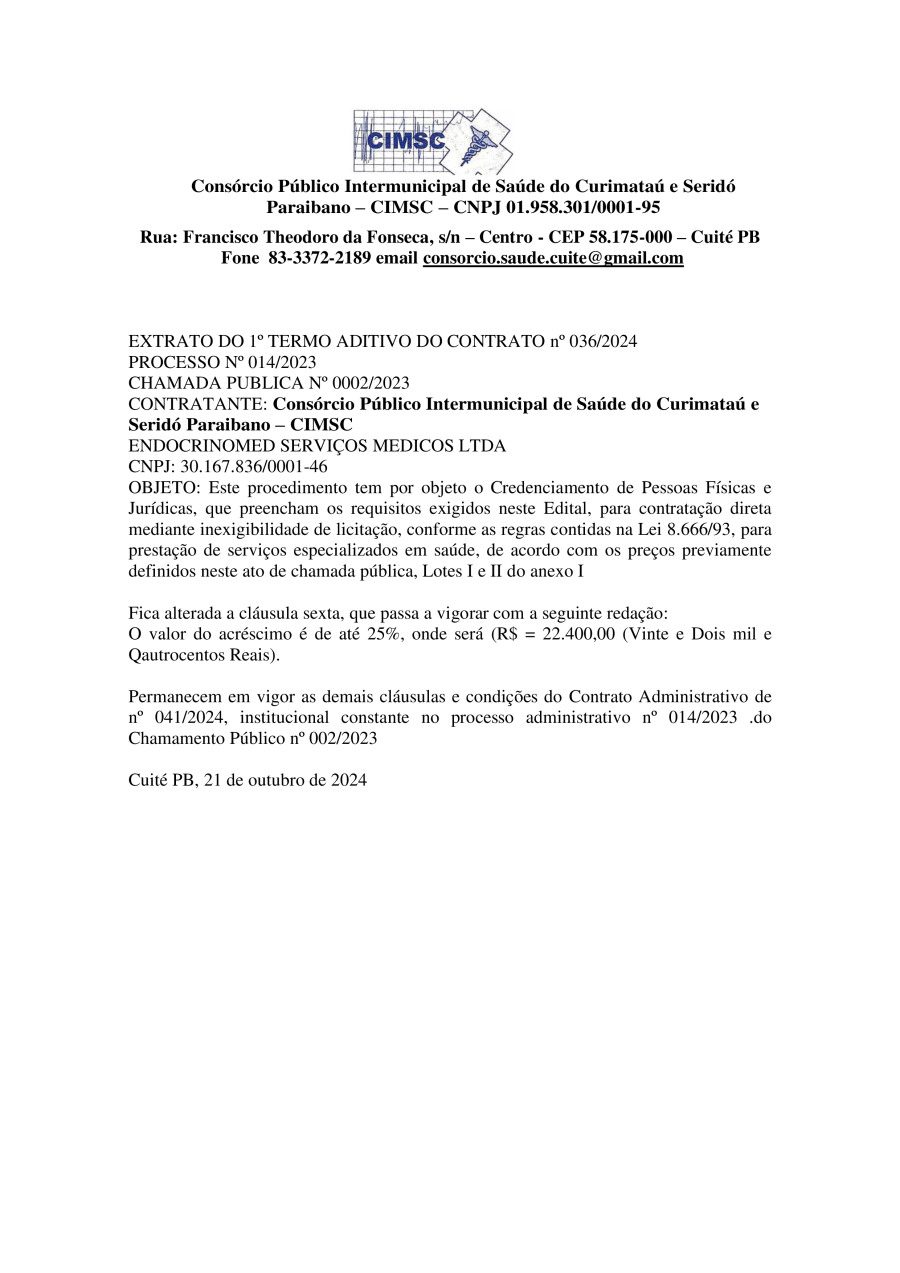 EXTRATO DO 1º TERMO ADITIVO DO CONTRATO Nº 0036/2024 - PROCESSO Nº 0014/2023 - CHAMADA PUBLICA Nº 0002/2023