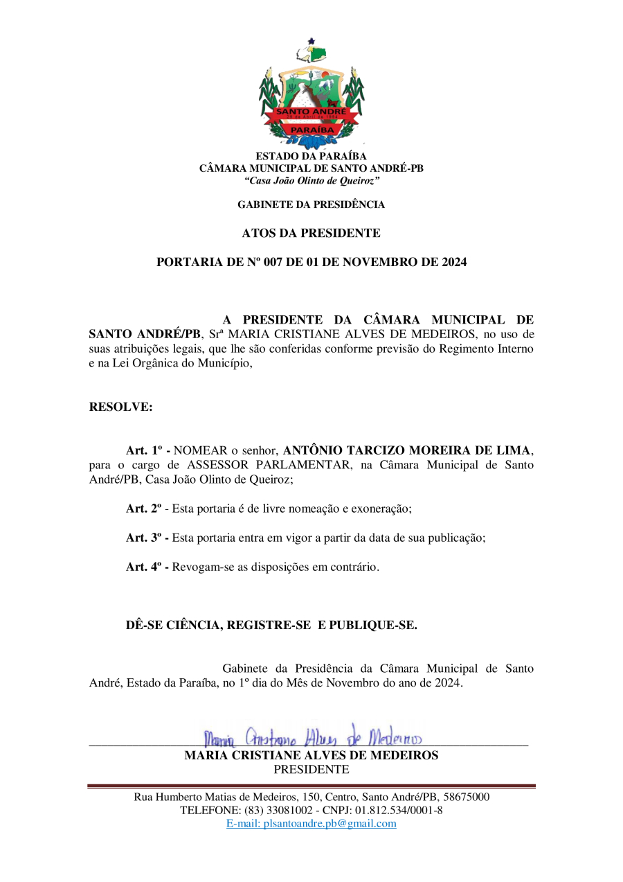 PORTARIA DE N° 0007/2024 - NOMEAÇÃO DO SENHOR ANTÔNIO TARCIZO MOREIRA DE LIMA