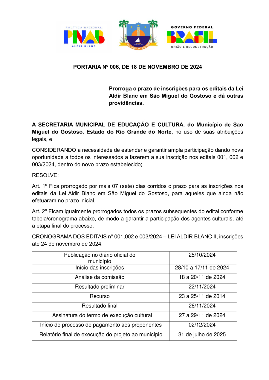 PORTARIA DE Nº 006, DE 18 DE NOVEMBRO DE 2024