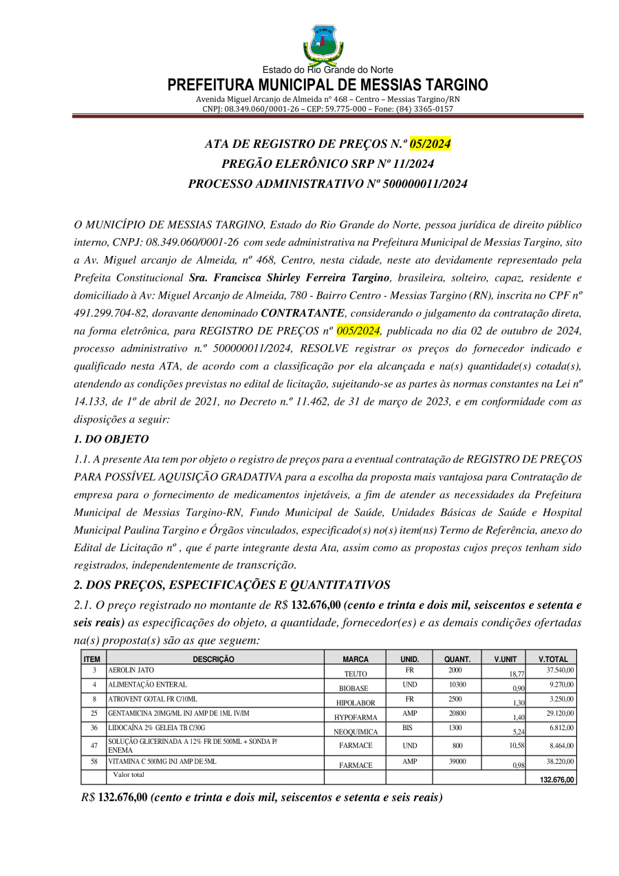 ATA DE REGISTRO DE PREÇOS N.º 05/2024 PE Nº 11/2024