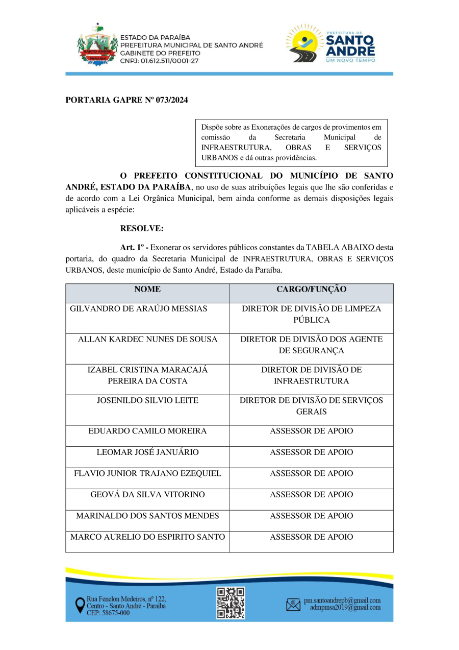 PORTARIA GAPRE Nº 073/2024 - DISPÕE SOBRE AS EXONERAÇÕES DE CARGOS DE PROVIMENTOS EM COMISSÃO DA SECRETARIA MUNICIPAL DE INFRAESTRUTURA, OBRAS E SERVIÇOS URBANOS E DÁ OUTRAS PROVIDÊNCIAS.