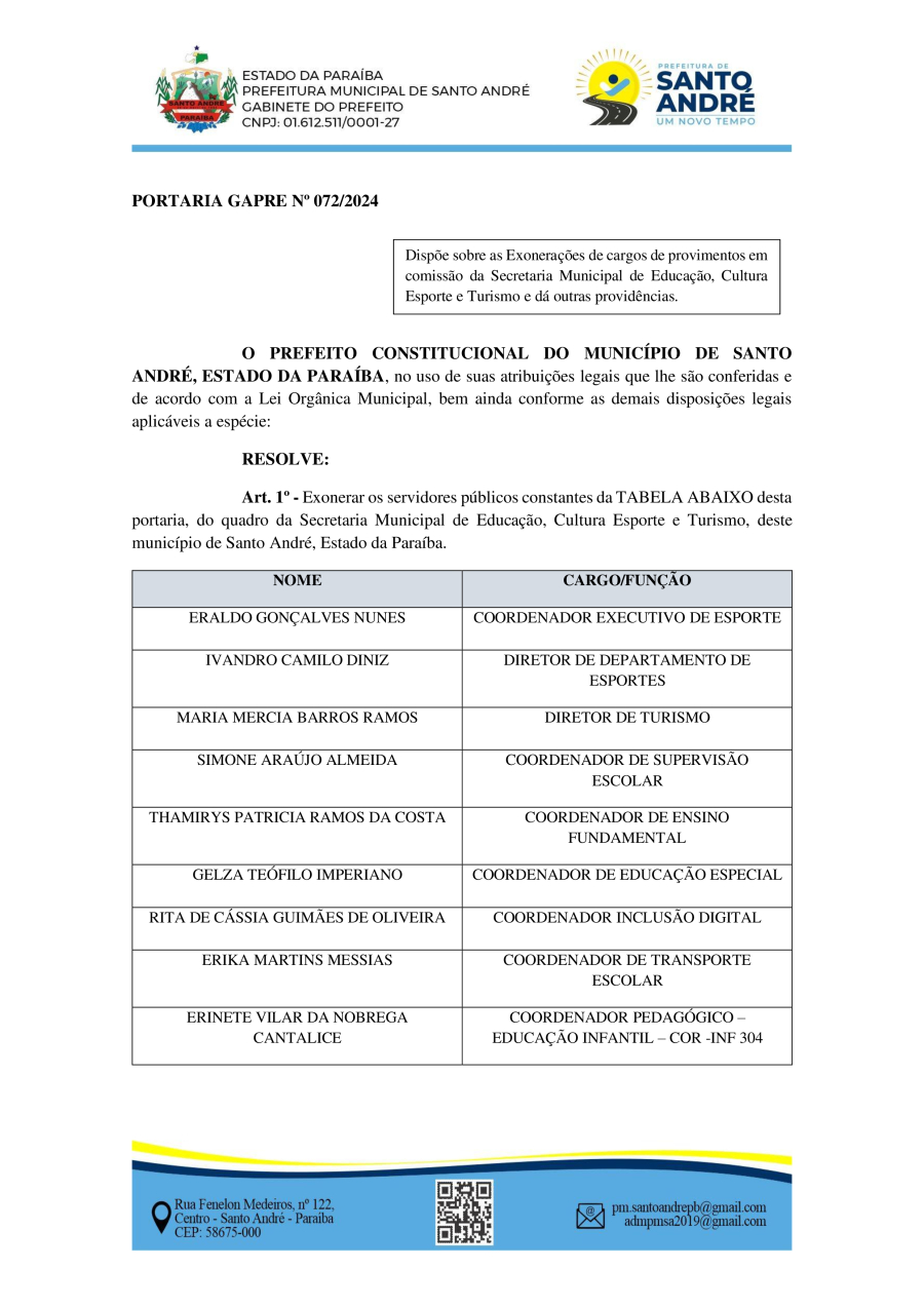 PORTARIA GAPRE Nº 072/2024 - DISPÕE SOBRE AS EXONERAÇÕES DE CARGOS DE PROVIMENTOS EM COMISSÃO DA SECRETARIA MUNICIPAL DE EDUCAÇÃO, CULTURA ESPORTE E TURISMO E DÁ OUTRAS PROVIDÊNCIAS