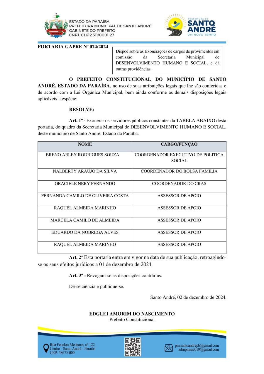 PORTARIA GAPRE Nº 074/2024 - DISPÕE SOBRE AS EXONERAÇÕES DE CARGOS DE PROVIMENTOS EM COMISSÃO DA SECRETARIA MUNICIPAL DE DESENVOLVIMENTO HUMANO E SOCIAL, E DÁ OUTRAS PROVIDÊNCIAS.
