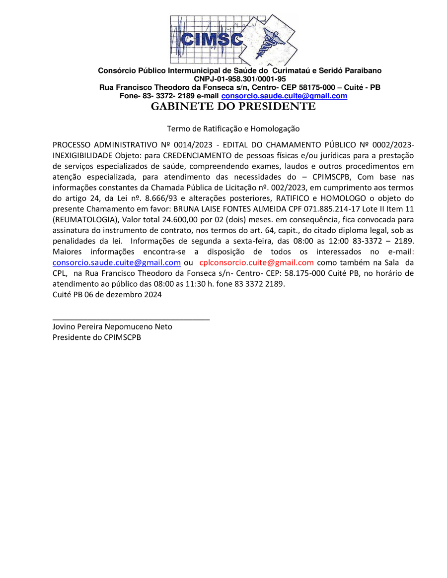 TERMO DE RATIFICAÇÃO E HOMOLOGAÇÃO - PROCESSO ADMINISTRATIVO N° 0014/2023 - EDITAL DO CHAMAMENTO PÚBLICO N° 0002/2023