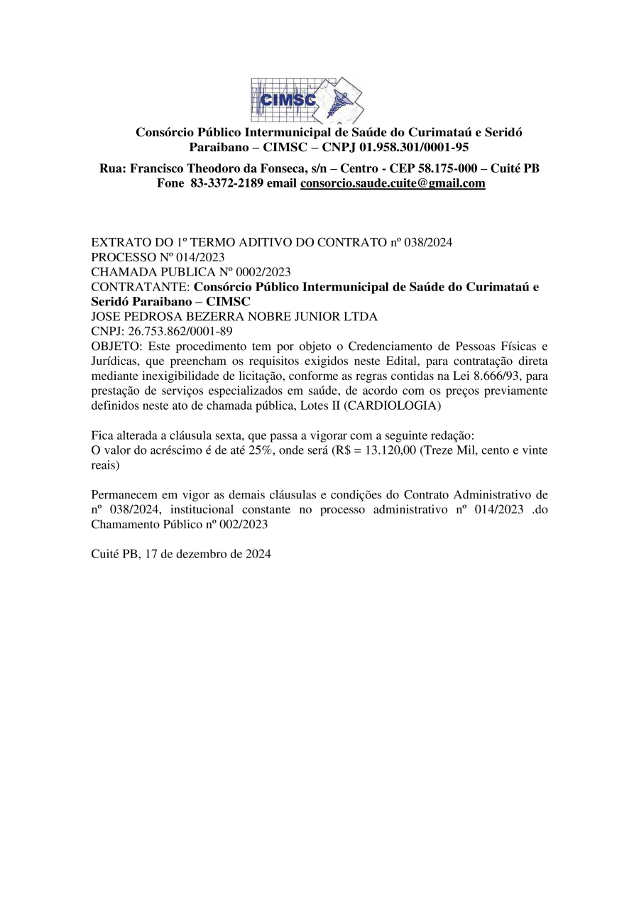 EXTRATO DO 1° TERMO ADITIVO DO CONTRATO N° 038/2024 - PROCESSO N° 0014/2023 - CHAMADA PUBLICA N° 0002/20024