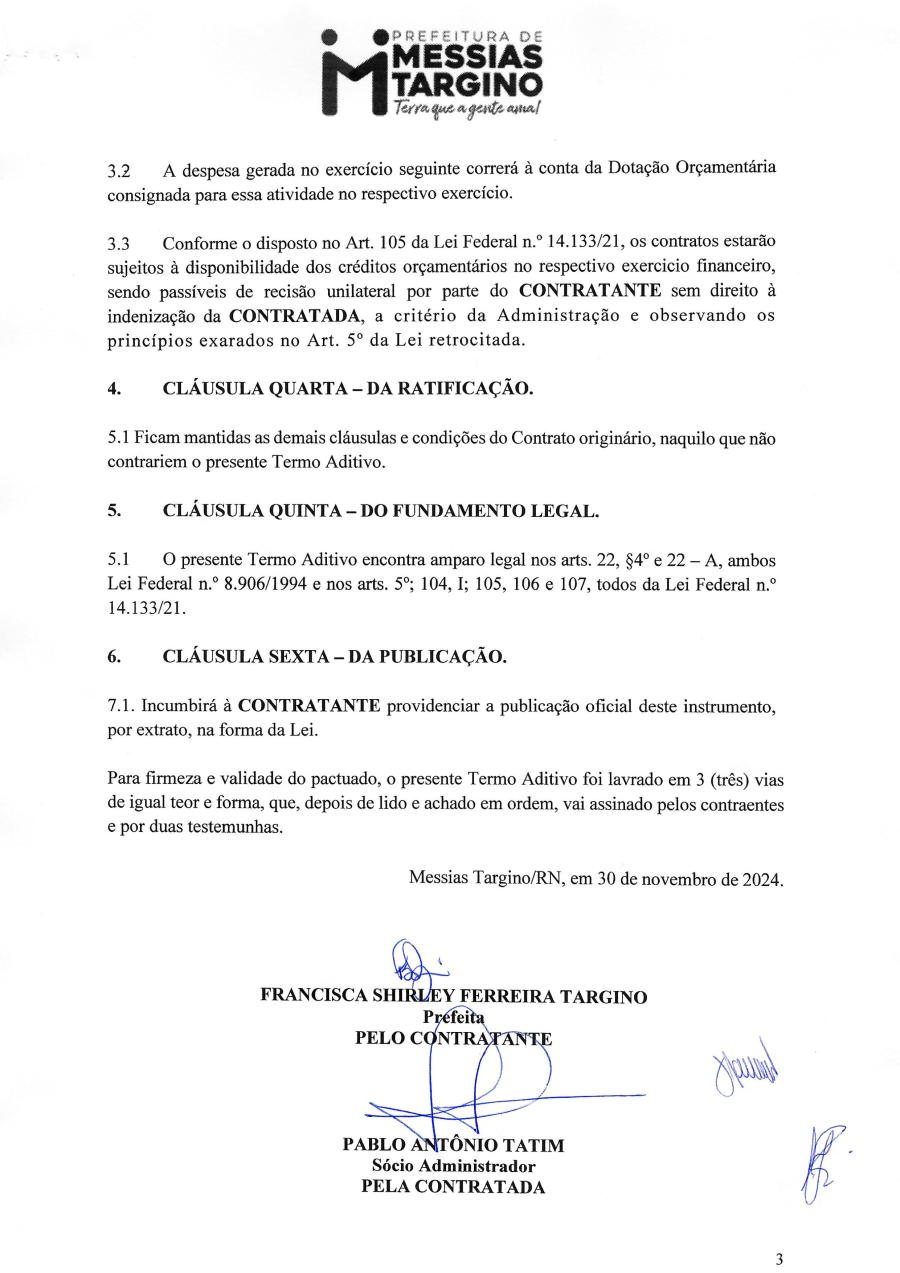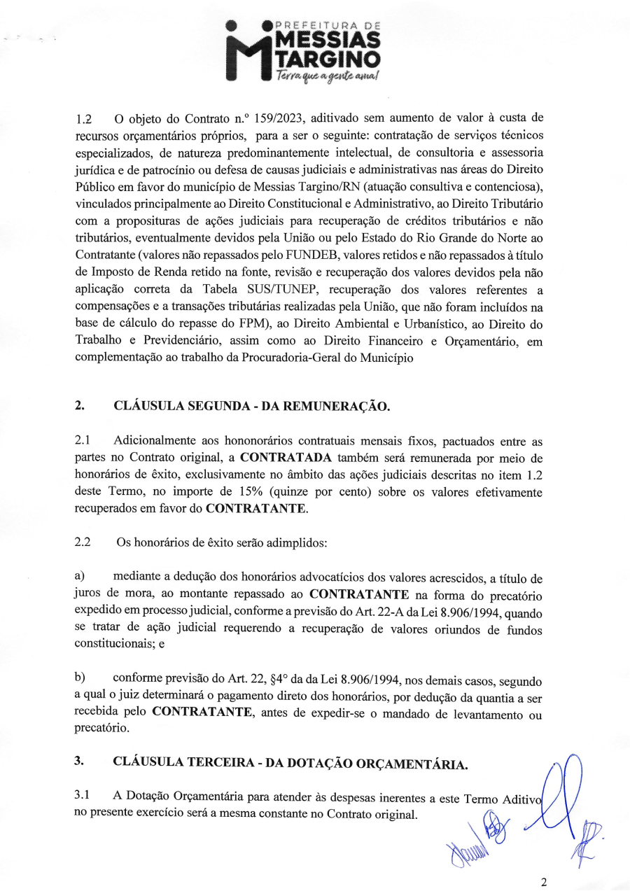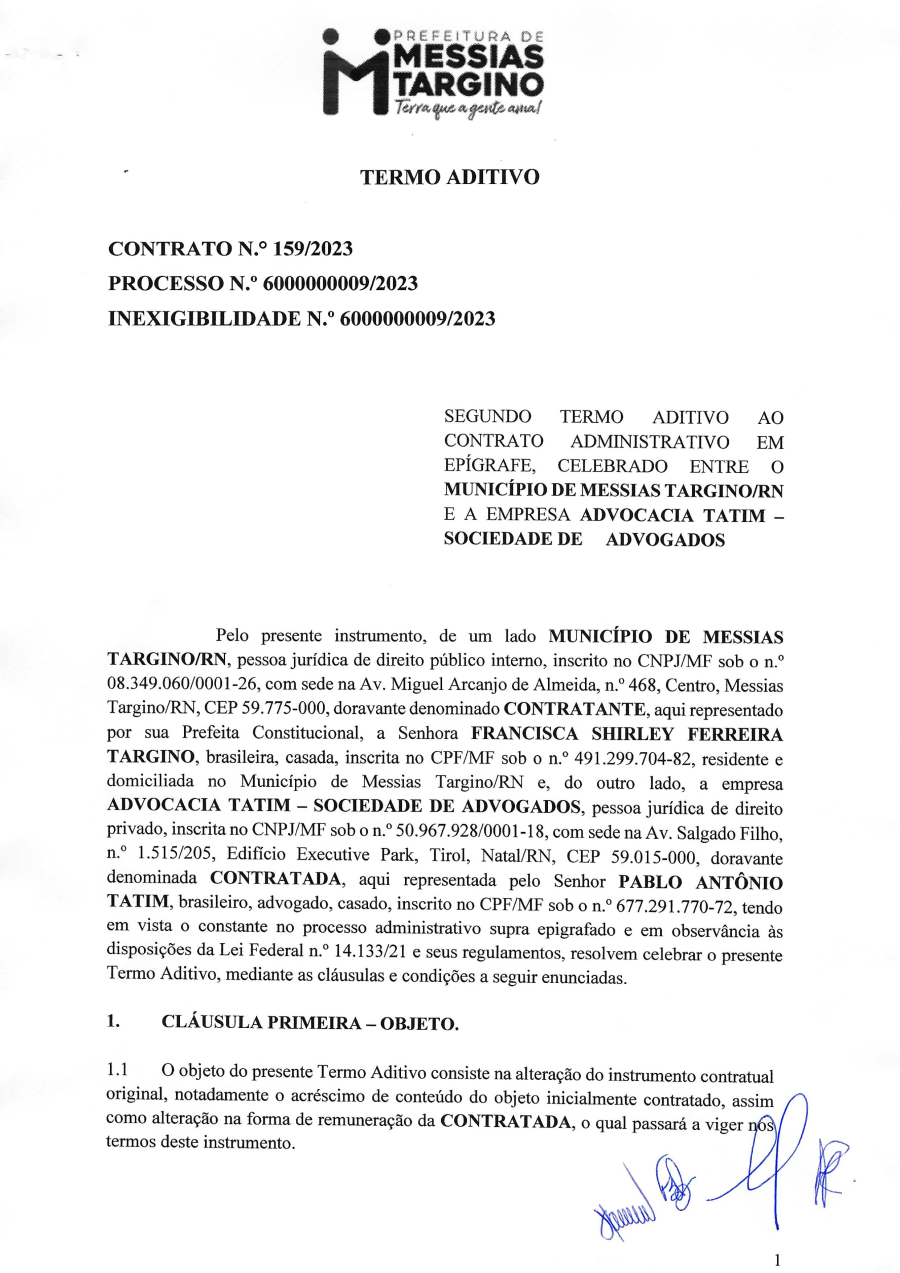 SEGUNDO TERMO ADITIVO AO CONTRATO ADMINISTRATIVO EM EPÍGRAFE, CELEBRADO ENTRE O MUNICÍPIO DE MESSIAS TARGINO/RN E A EMPRESA ADVOCACIA TATIM - SOCIEDADE DE ADVOGADOS.