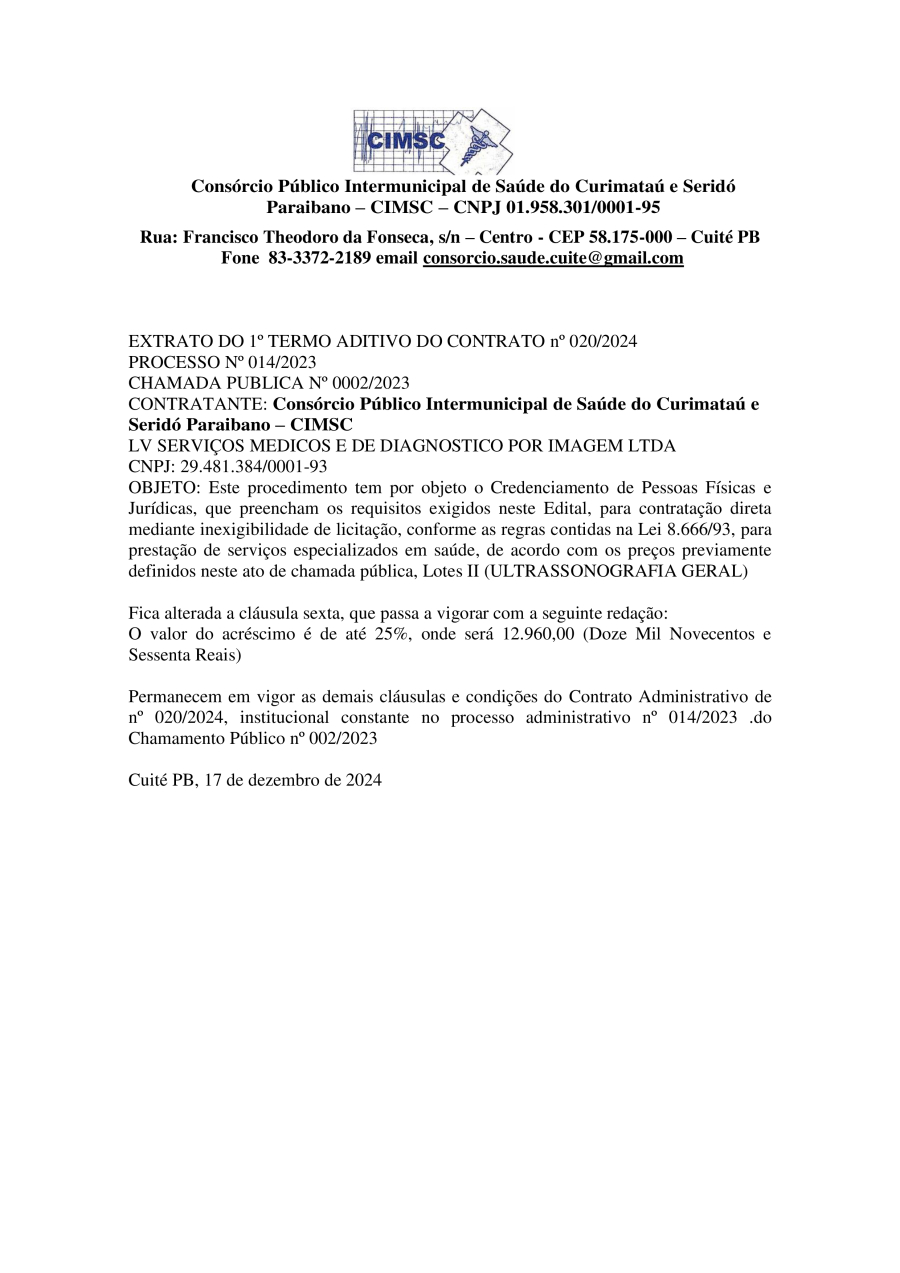 EXTRATO DO 1° TERMO ADITIVO DO CONTRATO N° 0020/2024 - PROCESSO N° 0014/2023 - CHAMADA PUBLICA N° 0002/2023