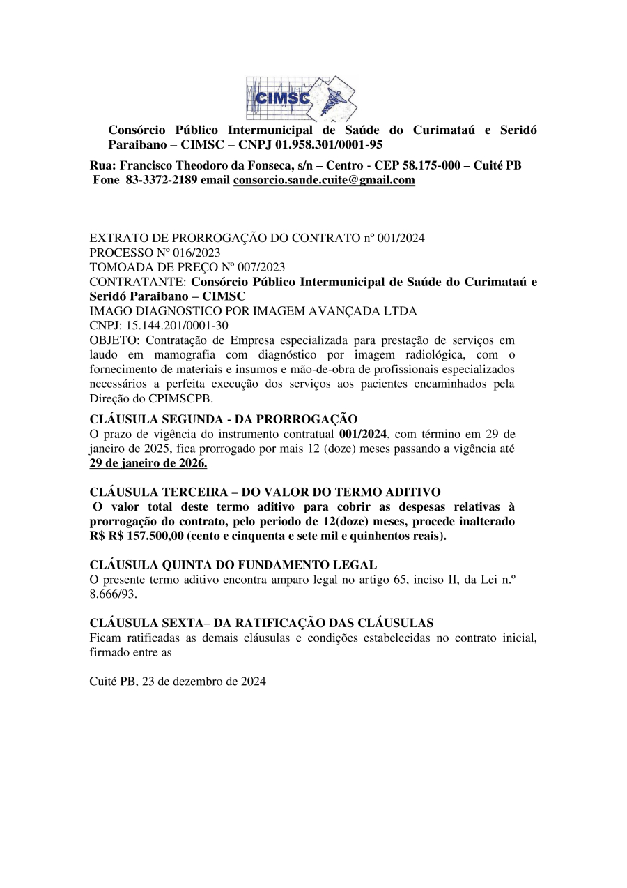 EXTRATO DE PRORROGAÇÃO DO CONTRATO N° 0001/2024 - PROCESSO N° 0016/2023 - TOMOADA DE PREÇO N° 0007/2023