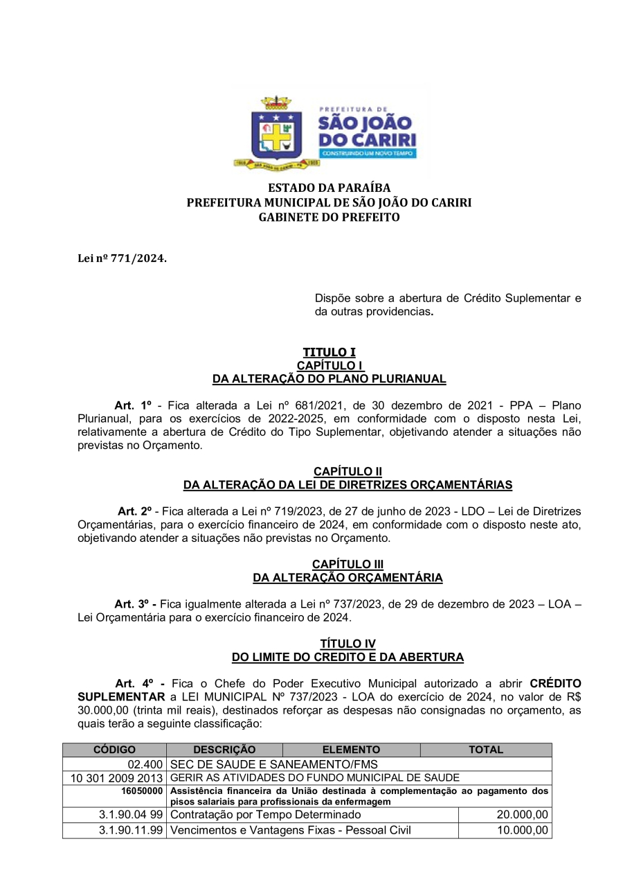 LEI 771/2024 - DISPÕE SOBRE A ABERTURA DE CRÉDITO SUPLEMENTAR E DA OUTRAS PROVIDENCIAS.