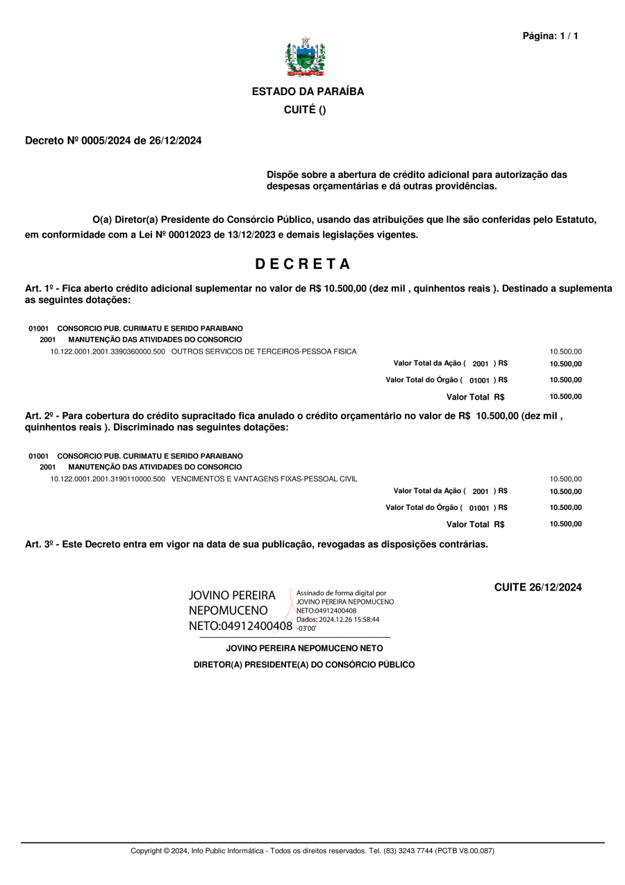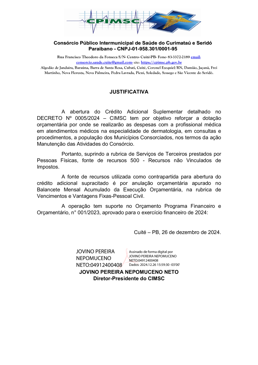 Conforme MP n° 2.200-2 de 24/08/2001, que institui a infraestrutura de chaves Públicas. Matéria Publicada no Diário Oficial do Consórcio Intermunicipal de Saúde do Curimataú e Seridó Paraibano/PB no dia - Edição 01131.