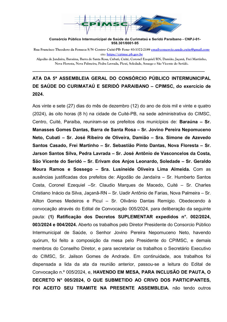 ATA DA 5ª ASSEMBLEIA GERAL DO CONSÓRCIO PÚBLICO INTERMUNICIPAL DE SAÚDE DO CURIMATAÚ E SERIDÓ PARAIBAN