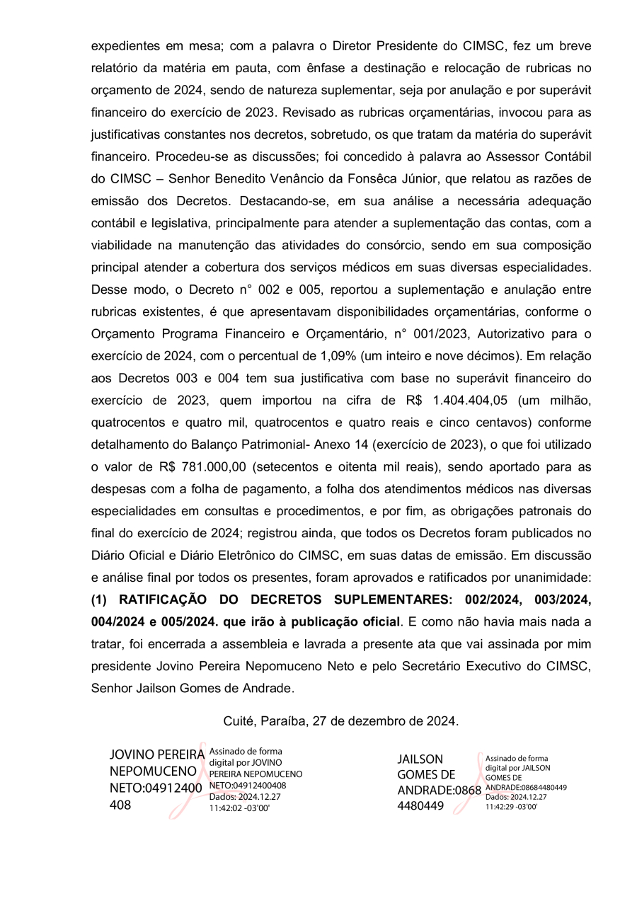 Conforme MP n° 2.200-2 de 24/08/2001, que institui a infraestrutura de chaves Públicas. Matéria Publicada no Diário Oficial do Consórcio Intermunicipal de Saúde do Curimataú e Seridó Paraibano/PB no dia - Edição 01132.
