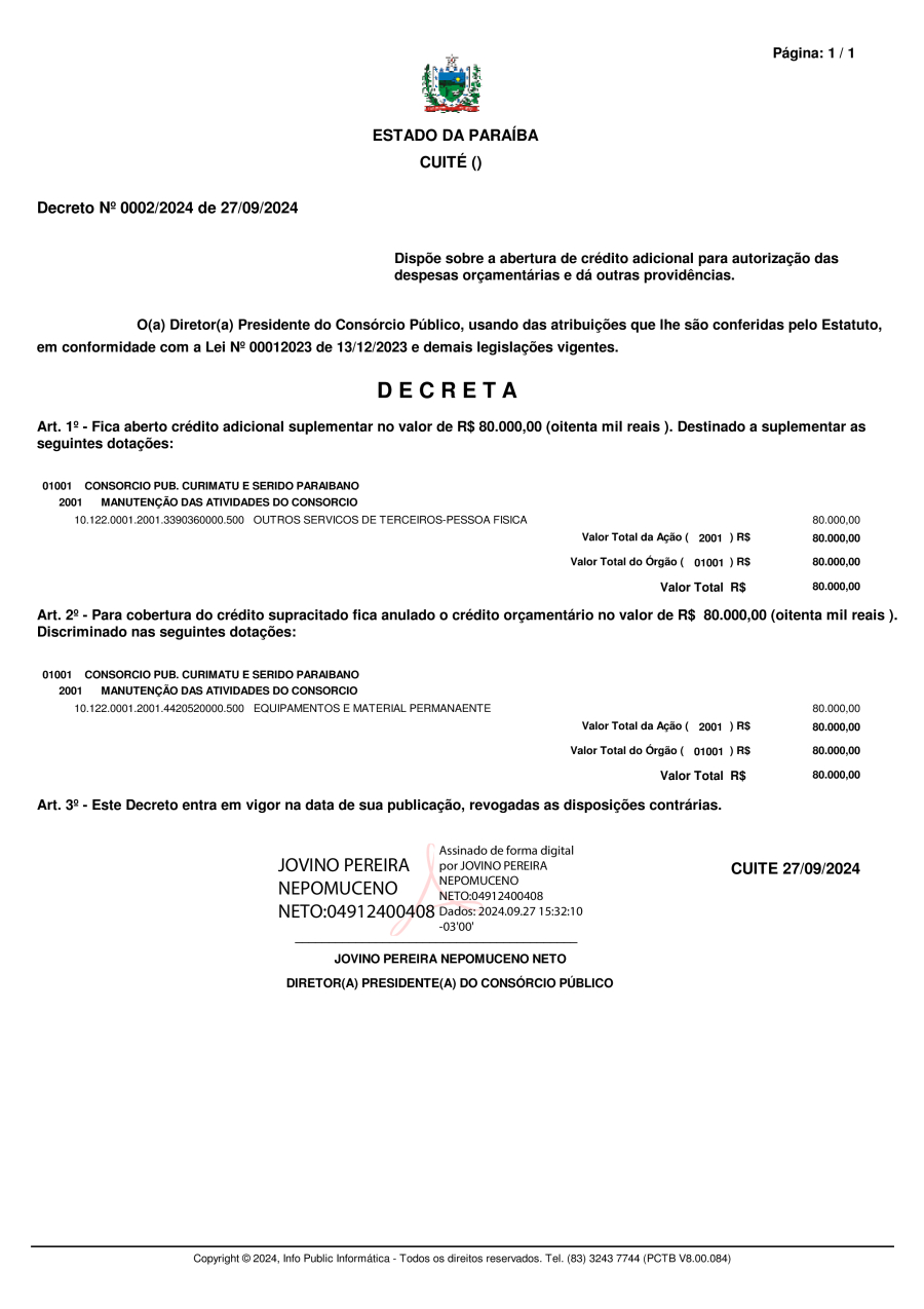 Conforme MP n° 2.200-2 de 24/08/2001, que institui a infraestrutura de chaves Públicas. Matéria Publicada no Diário Oficial do Consórcio Intermunicipal de Saúde do Curimataú e Seridó Paraibano/PB no dia - Edição 01132.
