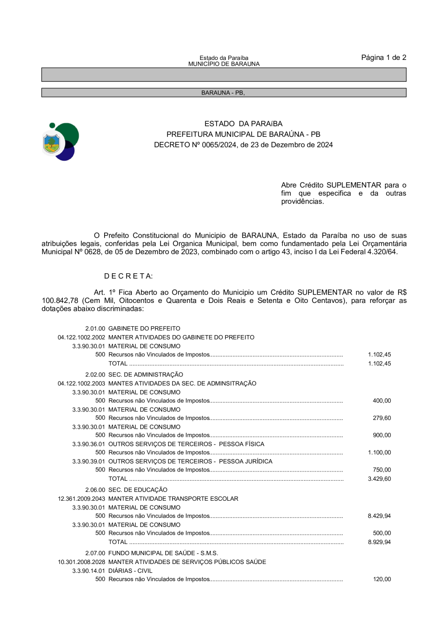 DECRETO Nº 065/2024 - ABRE CREDITO SUPLEMENTAR PARA O FIM QUE ESPECIFICA E DA OUTRAS PROVIDENCIAS. - 30 DE DEZEMBRO DE 2024.