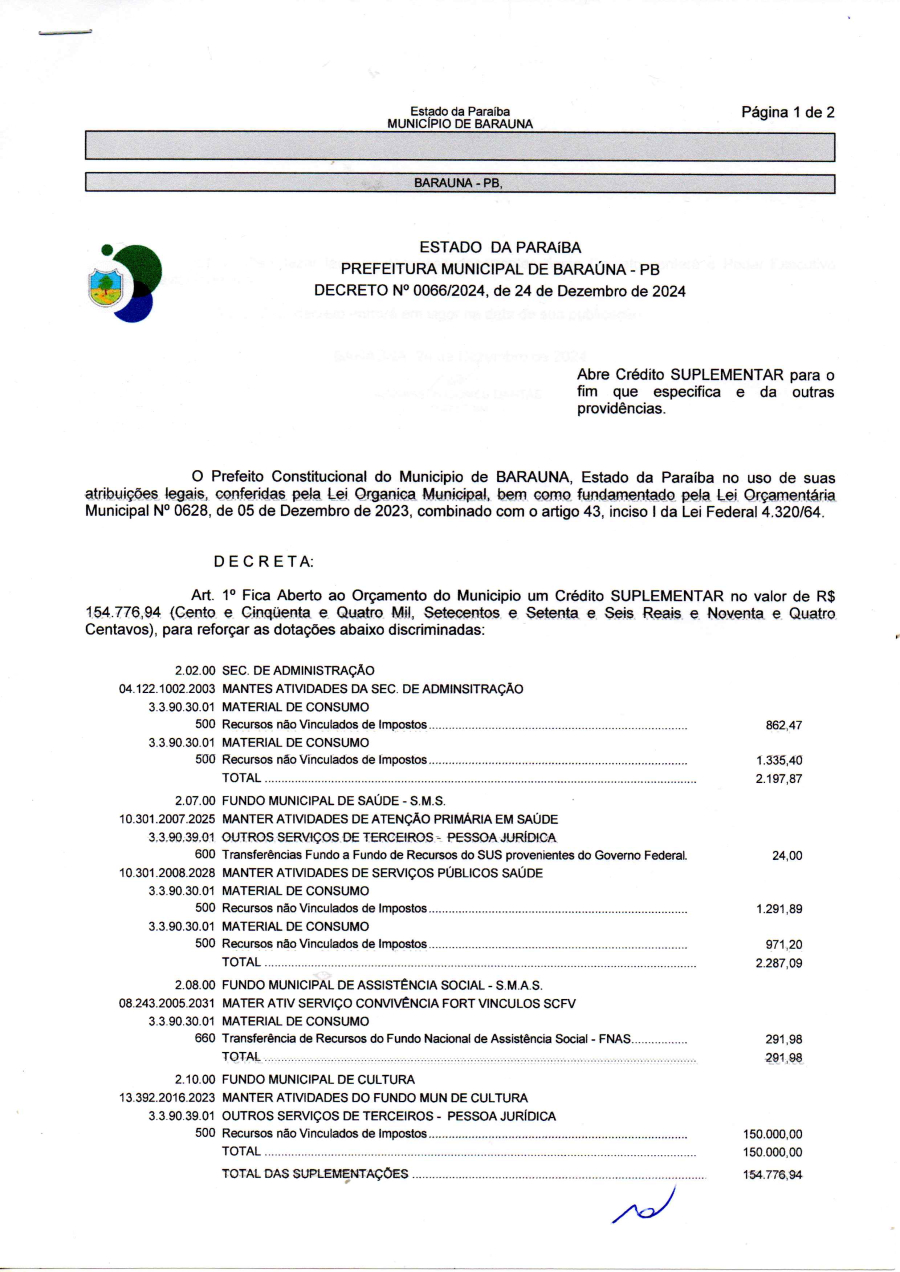 DECRETO Nº 066/2024 - ABRE CREDITO SUPLEMENTAR PARA O FIM QUE ESPECIFICA E DA OUTRAS PROVIDÊNCIAS. - 30 DE DEZEMBRO DE 2024.