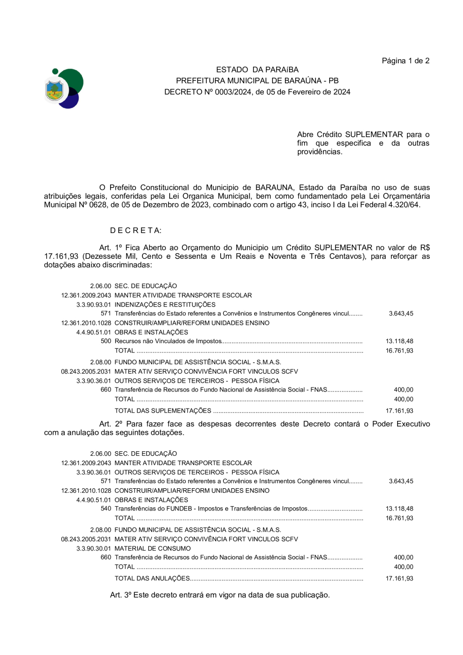 DECRETO Nº 003/2024 - ABRE CREDITO SUPLEMENTAR PARA O FIM QUE ESPECIFICA E DÁ OUTRAS PROVIDÊNCIAS. - 30 DE DEZEMBRO DE 2024.