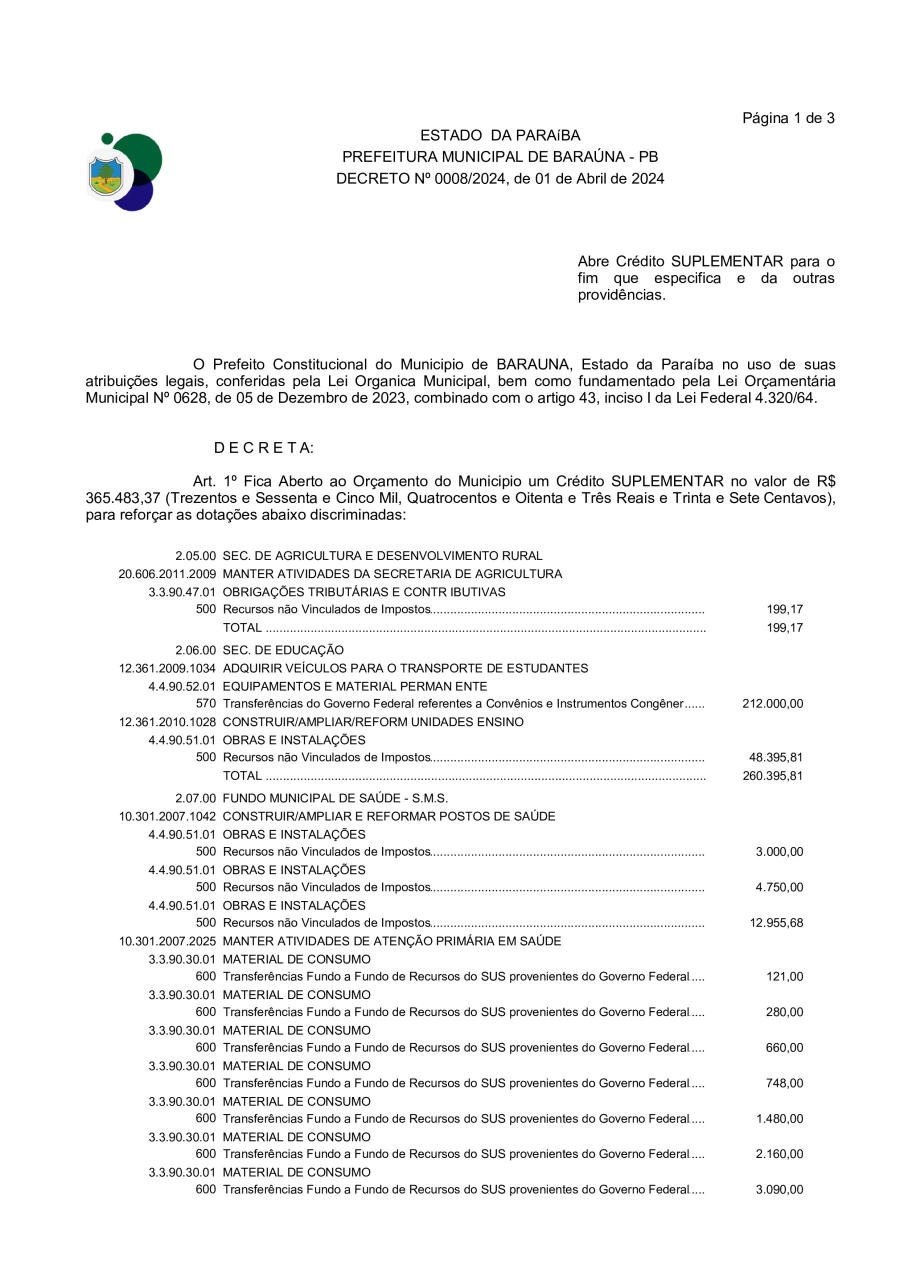 DECRETO Nº 008/2024 - ABRE CREDITO SUPLEMENTAR PARA O FIM QUE ESPECIFICA E DÁ OUTRAS PROVIDÊNCIAS. - 30 DE DEZEMBRO DE 2024.