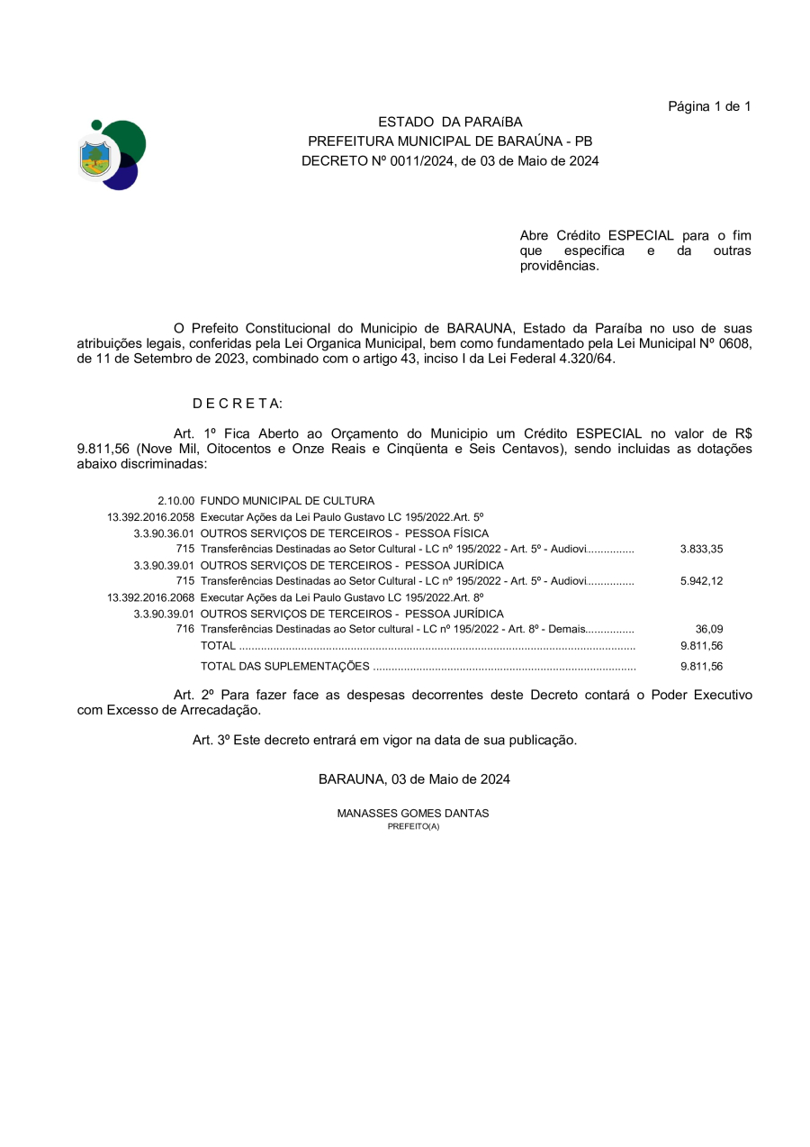 DECRETO Nº 011/2024 - ABRE CREDITO ESPECIAL PARA O FIM QUE ESPECIFICA E DÁ OUTRAS PROVIDÊNCIAS. 30 DE DEZEMBRO DE 2024.