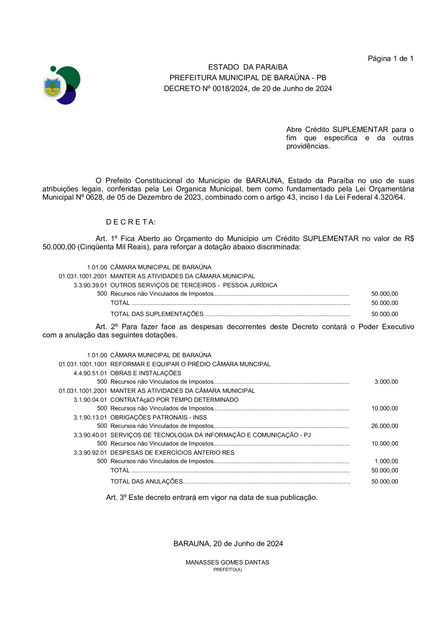 DECRETO Nº 018/2024 - ABRE CREDITO SUPLEMENTAR PARA O FIM QUE ESPECIFICA E DÁ OUTRAS PROVIDÊNCIAS. - 30 DE DEZEMBRO DE 20204.