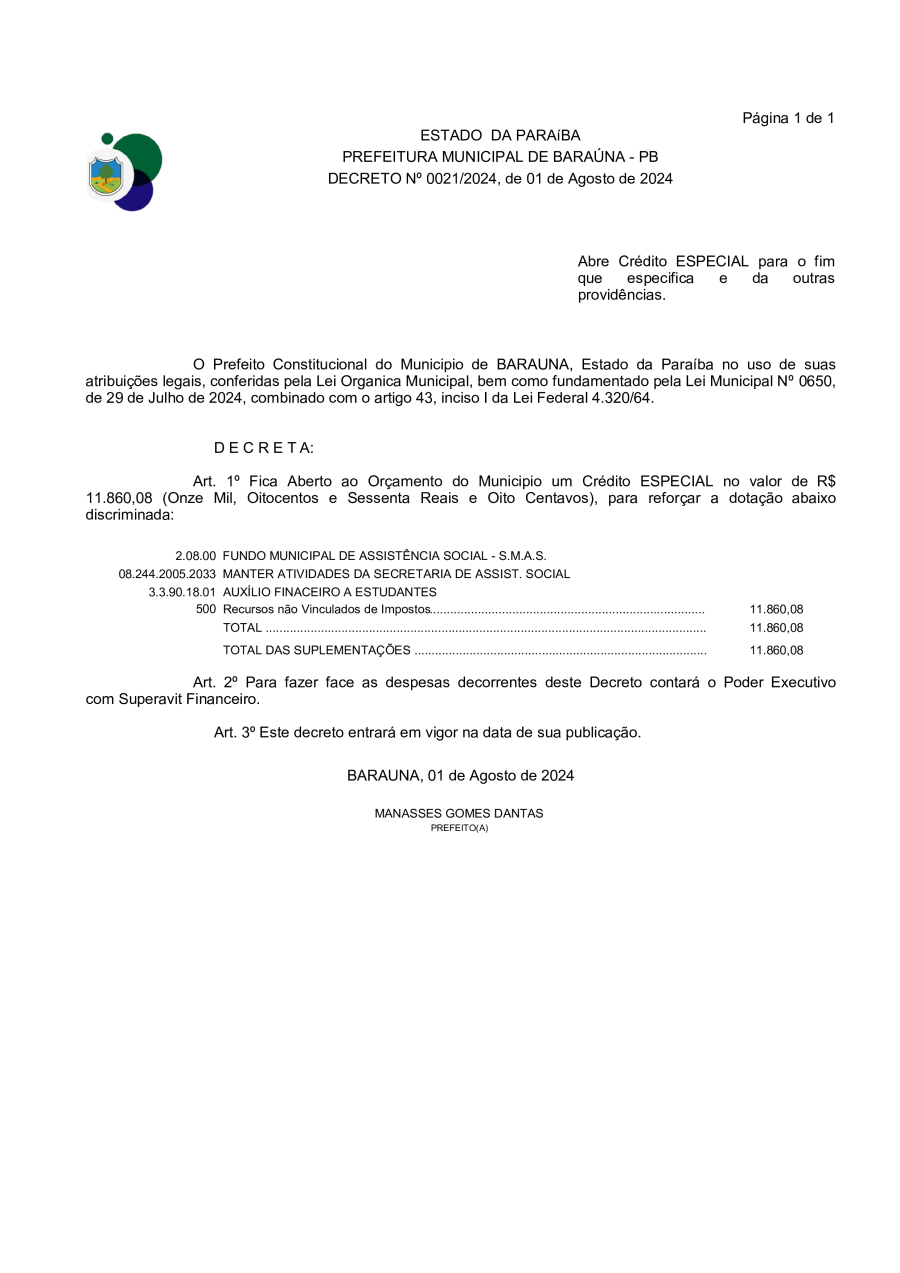 DECRETO Nº 021/2024 - ABRE CREDITO ESPECIAL PARA O FIM QUE ESPECIFICA E DA OUTRAS PROVIDÊNCIAS. - 30 DE DEZEMBRO DE 2024.
