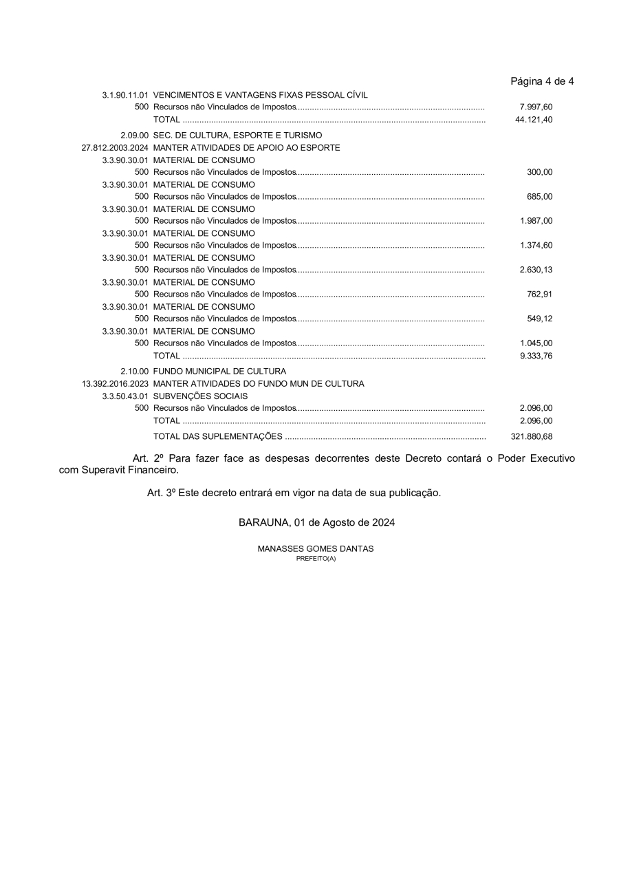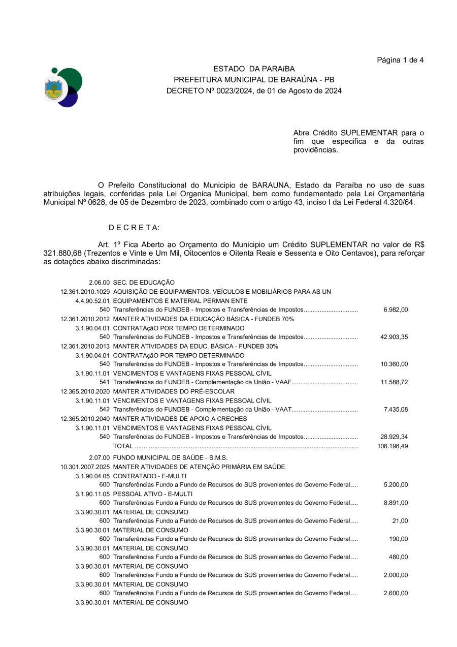 DECRETO Nº 023/2024 - ABRE CREDITO SUPLEMENTAR PARA O FIM QUE ESPECIFICA E DA OUTRAS PROVIDÊNCIAS. - 30 DE DEZEMBRO DE 2024.