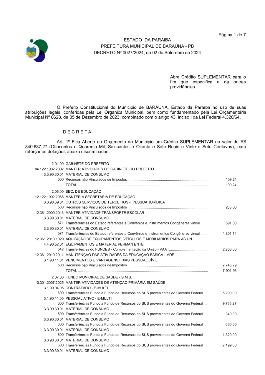 DECRETO Nº 027/2024 - ABRE CREDITO SUPLEMENTAR PARA O FIM QUE ESPECIFICA E DA OUTRAS PROVIDÊNCIAS. - 30 DE DEZEMBRO DE 2024.