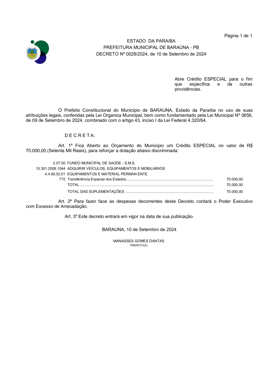 DECRETO Nº 028/2024 - ABRE CREDITO ESPECIAL PARA O FIM QUE ESPECIFICA E DA OUTRA PROVIDÊNCIAS. 30 DE DEZEMBRO DE 2024.