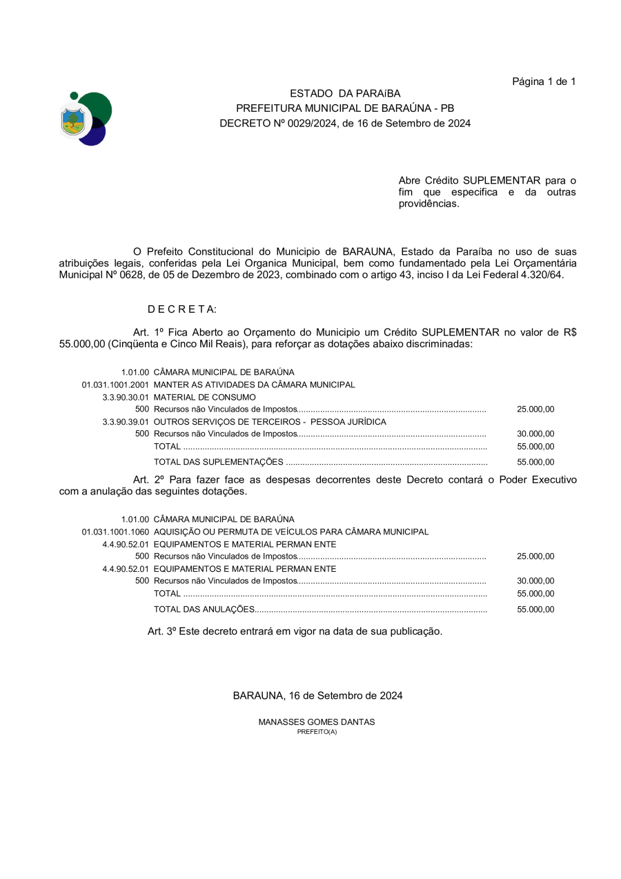 DECRETO Nº 029/2024 - ABRE CREDITO SUPLEMENTAR PARA O FIM QUE ESPECIFICA E DÁ OUTRAS PROVIDÊNCIAS. - 30 DE DEZEMBRO DE 2024.