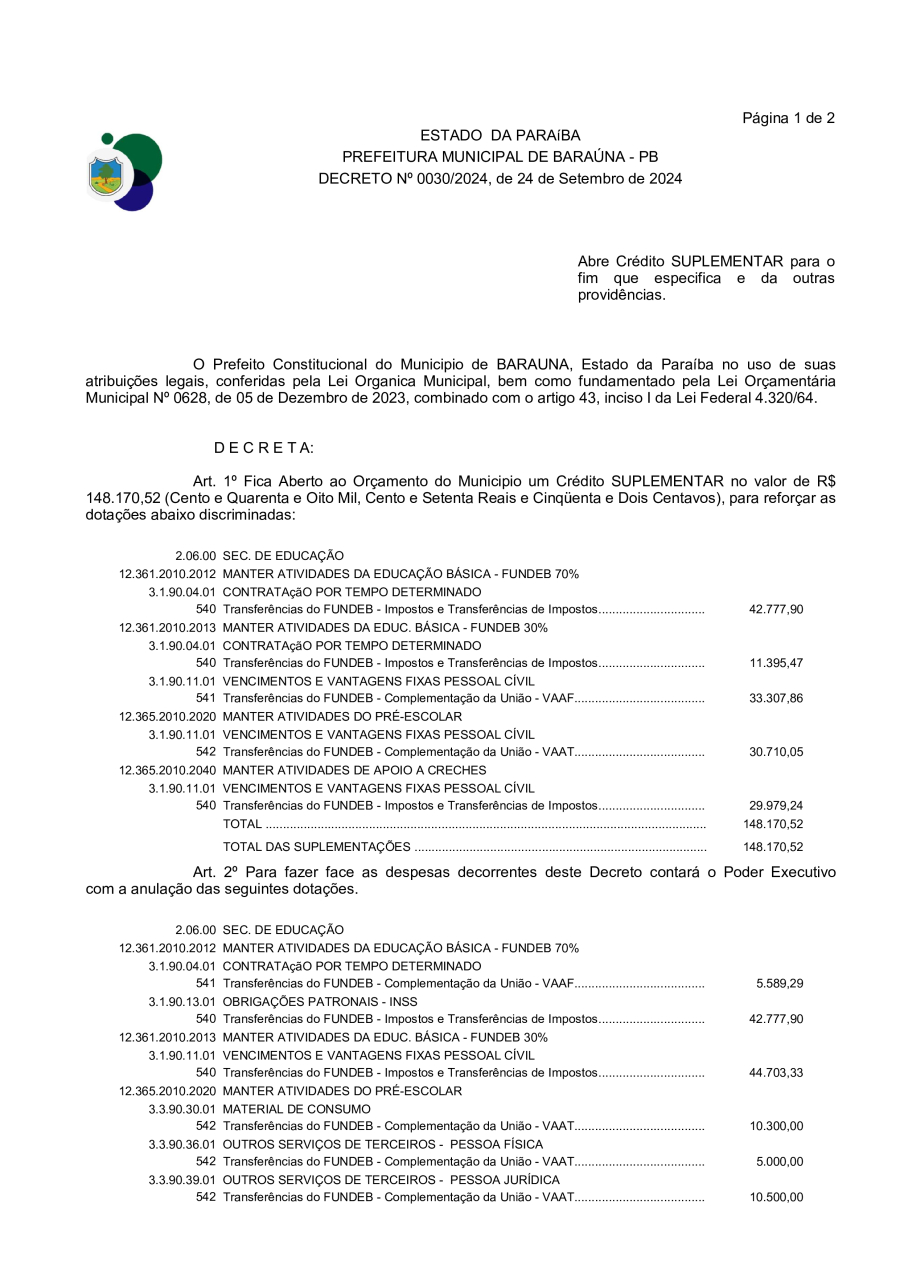 DECRETO Nº 030/2024 - ABRE CREDITO SUPLEMENTAR PARA O FIM QUE ESPECIFICA E DA OUTRAS PROVIDÊNCIAS.