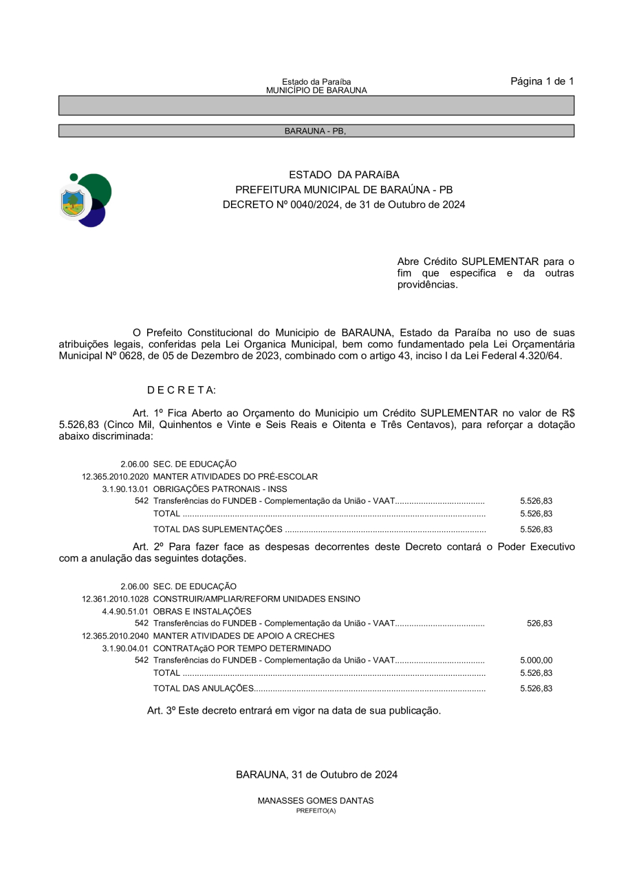 DECRETO Nº 040/2024 - ABRE CREDITO SUPLEMENTAR PARA O FIM QUE ESPECIFICA E DA OUTRAS PROVIDÊNCIAS. - 30 DE DEZEMBRO DE 2024.