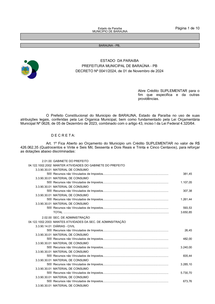 DECRETO Nº 041/2024 - ABRE CREDITO SUPLEMENTAR PARA O FIM QUE ESPECIFICA E DA OUTRAS PROVIDÊNCIAS. - 30 DE DEZEMBRO DE 2024.