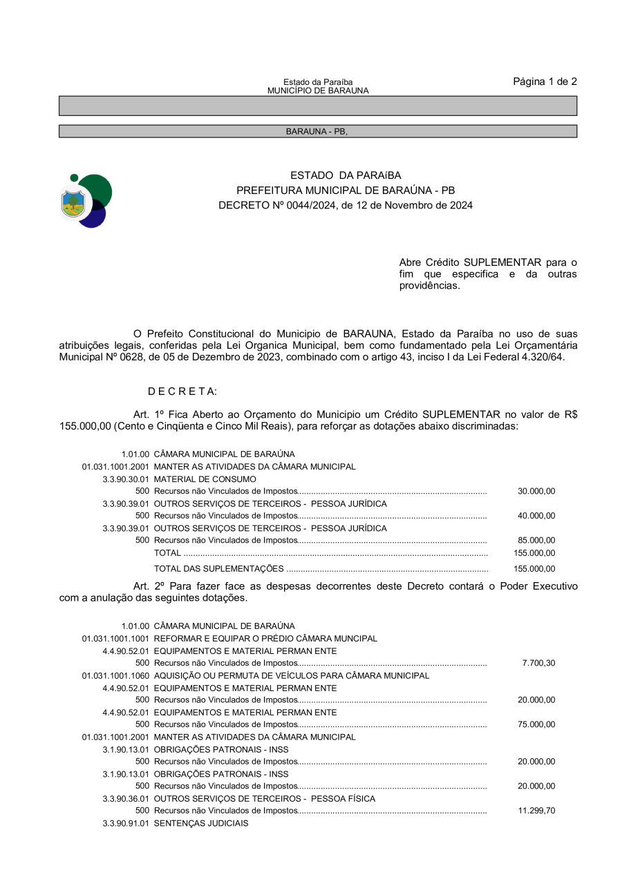 DECRETO Nº 044/2024 - ABRE CREDITO SUPLEMENTAR PARA O FIM QUE ESPECIFICA E DA OUTRAS PROVIDÊNCIAS. - 30 DED DEZEMBRO DE 2024.