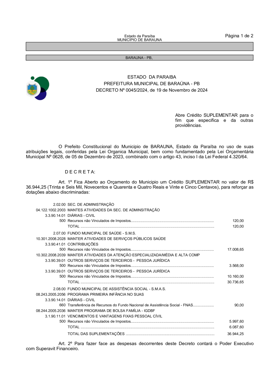 DECRETO Nº 045/2024 - ABRE CREDITO SUPLEMETAR PARA O FIM QUE ESPECIFICA E DA OUTRAS PROVIDÊNCIAS. - 30 DE DEZEMBRO DE 2024.