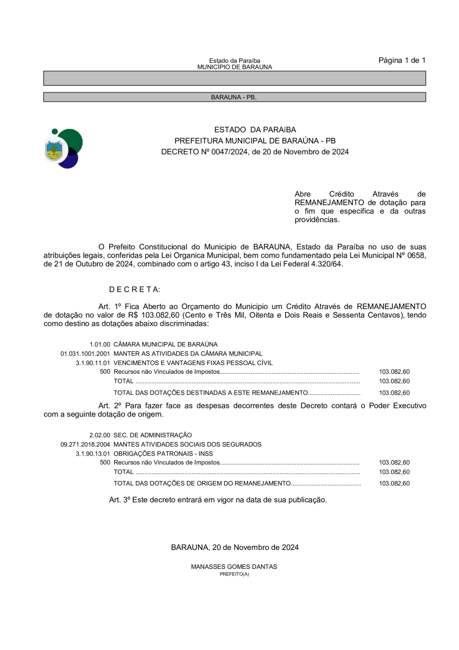 DECRETO Nº 047/2024 - ABRE CREDITO ATRAVES DE REMANEJAMENTO DE DOTAÇÕES PARA O FIM QUE ESPECIFICA E DA OUTRAS PROVIDÊNCIAS. - 30 DE DEZEMBRO DE 2024.