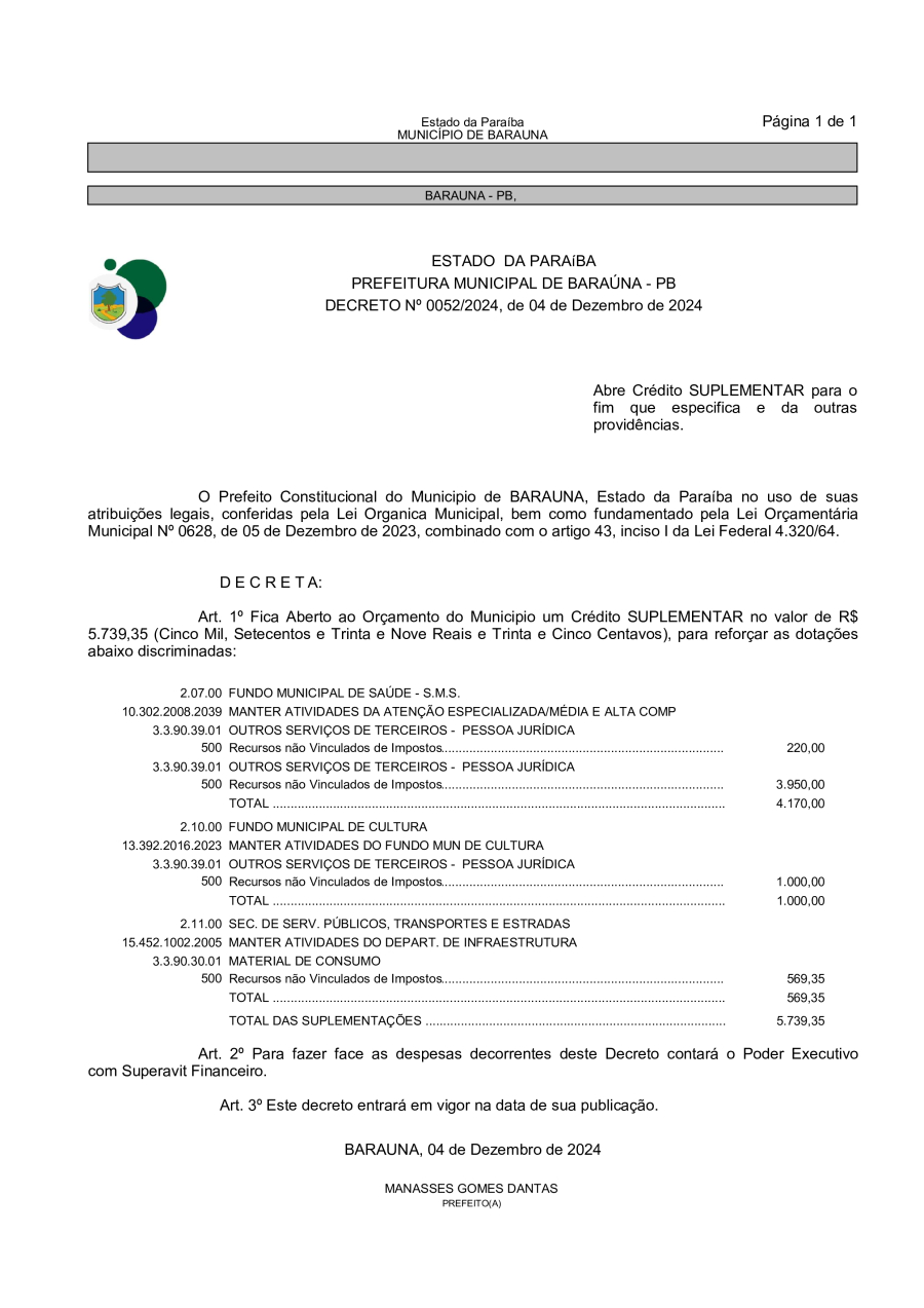 DECRETO Nº 052/2024 - ABRE CREDITO SUPLEMENTAR PARA O FIM QUE ESPECIFICA E DA OUTRAS PROVIDÊNCIAS. - 30 DE DEZEMBRO DE 20204.