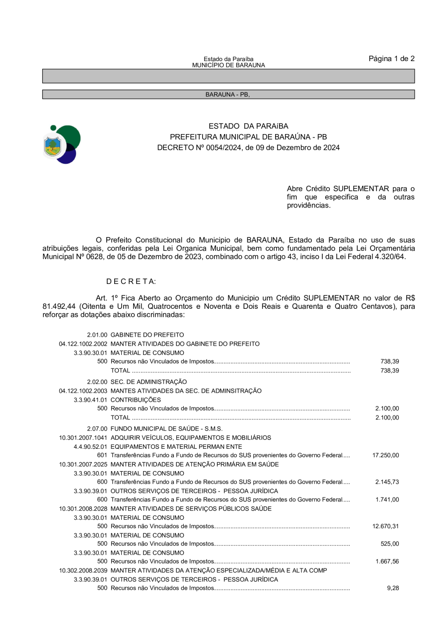 DECRETO Nº 054/2024 - ABRE CREDITO SUPLEMENTAR PARA O FIM QUE ESPECIFICA E DÁ OUTRAS PROVIDÊNCIAS. - 30 DE DEZEMBRO DE 2024.