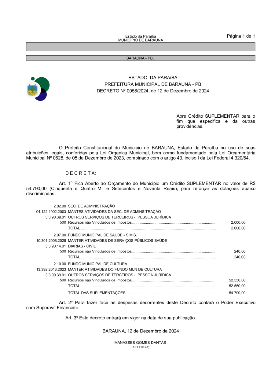 DECRETO Nº 058/2024 - ABRE CREDITO SUPLEMENTAR PARA I FIM QUE ESPECIFICA E DÁ OUTRAS PROVIDÊNCIAS. - 30DE DEZEMBRO DE 2024.