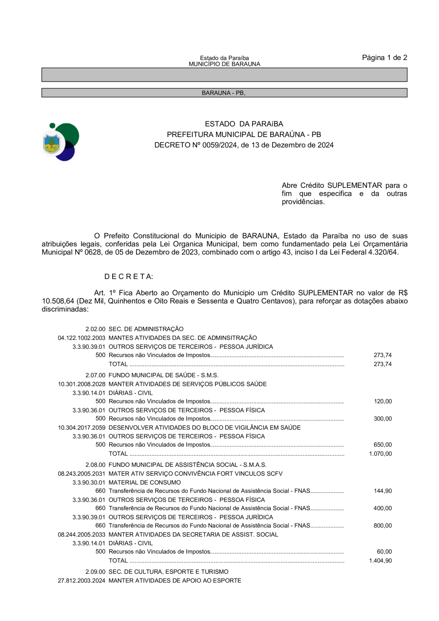 DECRETO Nº 059/2024 - ABRE CREDITO SUPLEMENTAR PARA O FIM QUE ESPECIFICA E DA OUTRAS PROVIDÊNCIAS. - 30 DE DEZEMBRO DE 2024.