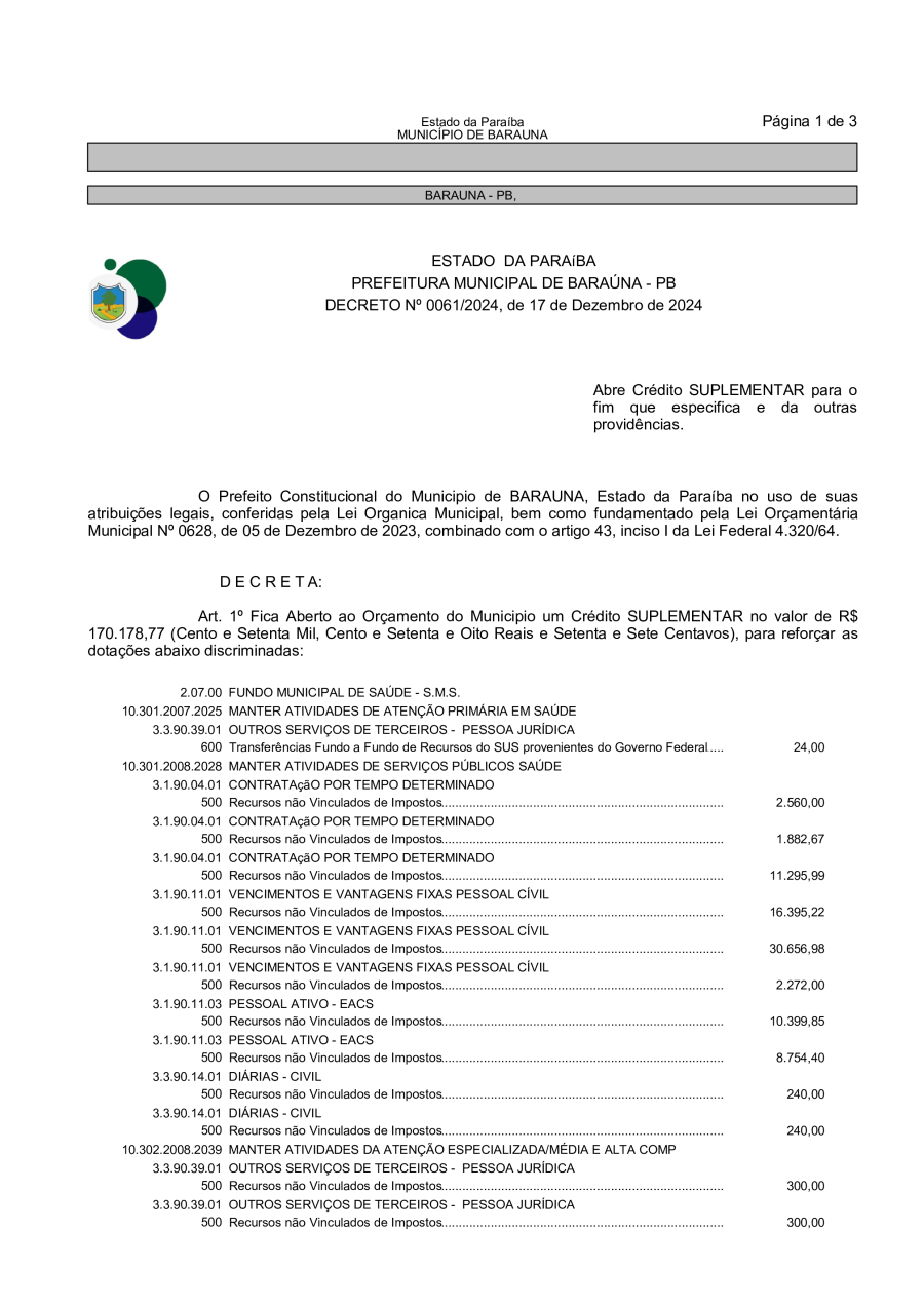 DECRETO Nº 061/2024 - ABRE CREDITO SUPLEMENTAR PARA O FIM QUE ESPECIFICA E DA OUTRAS PROVIDÊNCIAS. - 30 DE DEZEMBRO DE 2024.