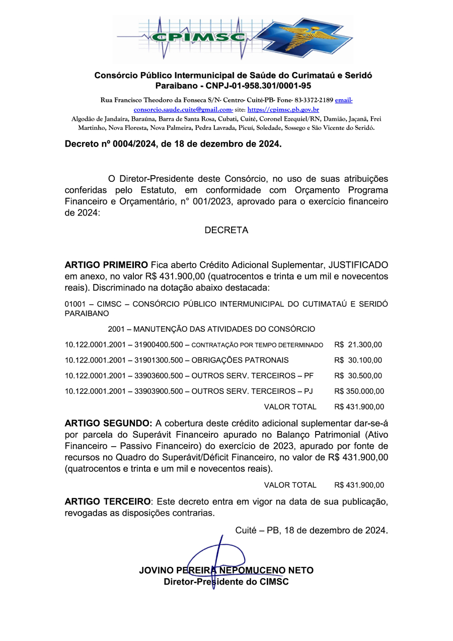 DECRETO N° 0004/2024 - RETROATIVO AO DIA 18 DE DEZEMBRO DE 2024