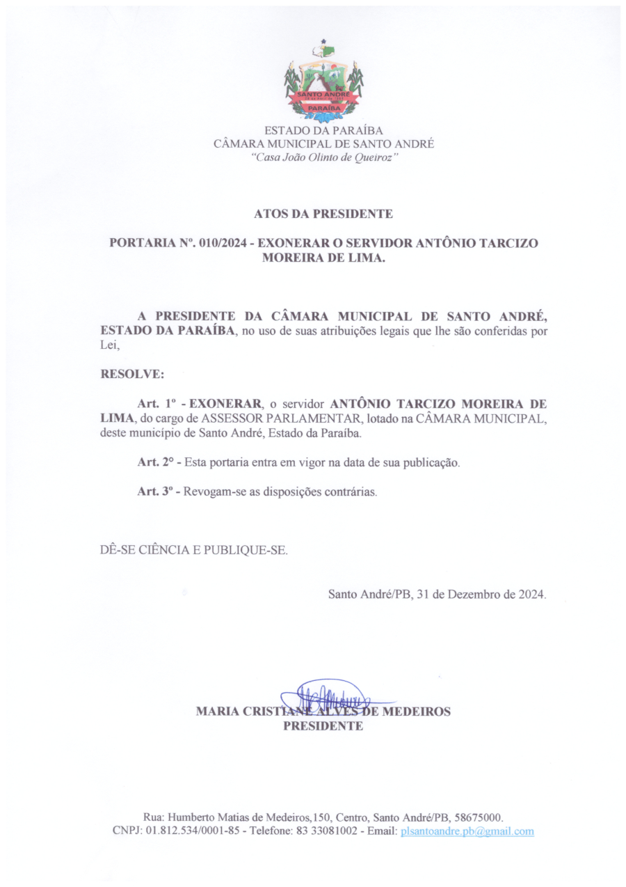 PORTARIA N° 0010/2024 - EXONERAR O SERVIDOR ANTÔNIO TARCIZO MOREIRA DE LIMA