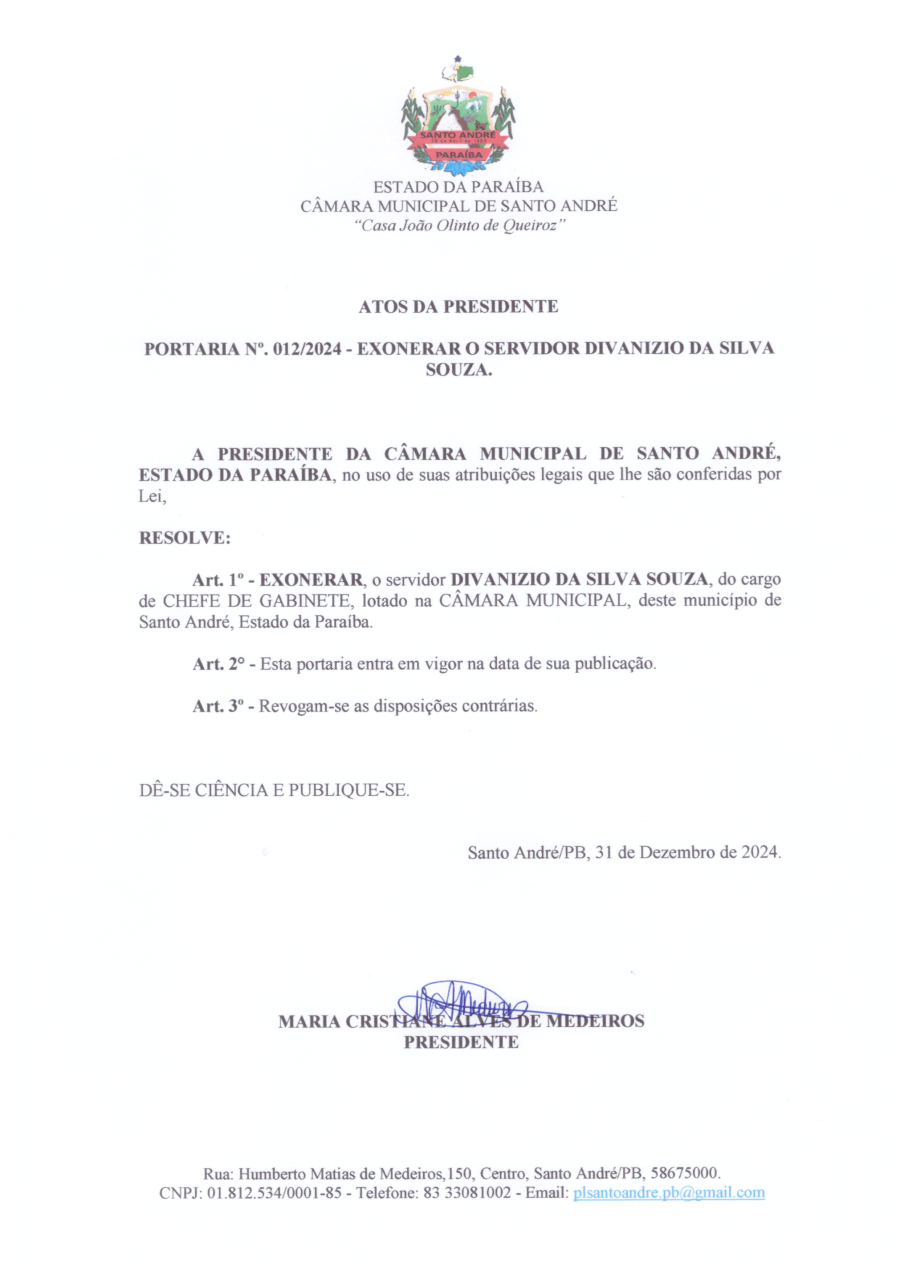 PORTARIA N° 0012/2024 - EXONERAR O SERVIDOR DIVANIZIO DA SILVA SOUZA