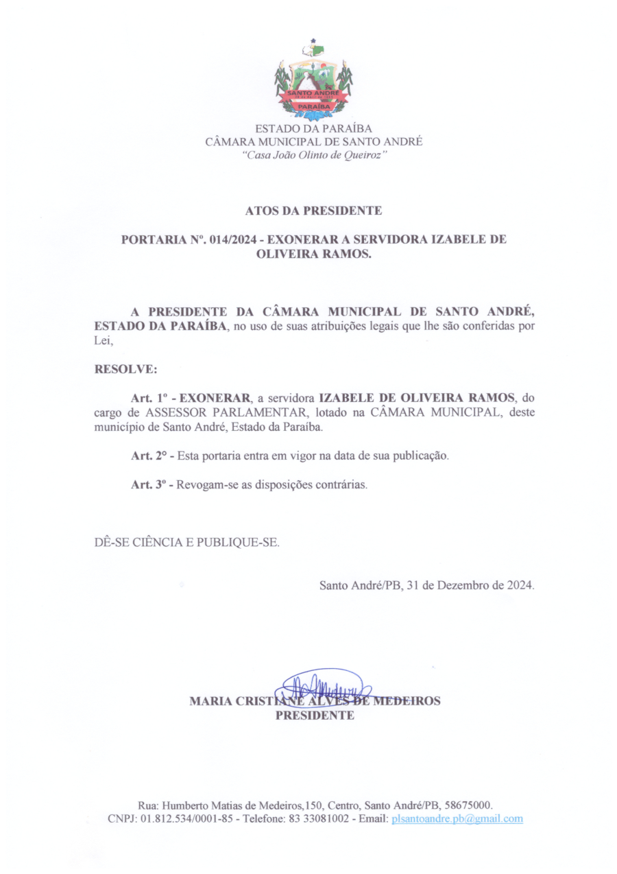 PORTARIA N° 0014/2024 - EXONERAR A SERVIDORA IZABELE DE OLIVEURA RAMOS